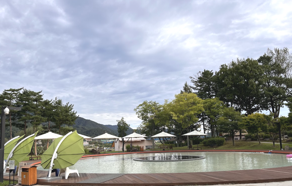 야외 공간에는 넓은 잔디 공원과, 발을 담그며 놀 수 있는 야외 풀장, 산책로,