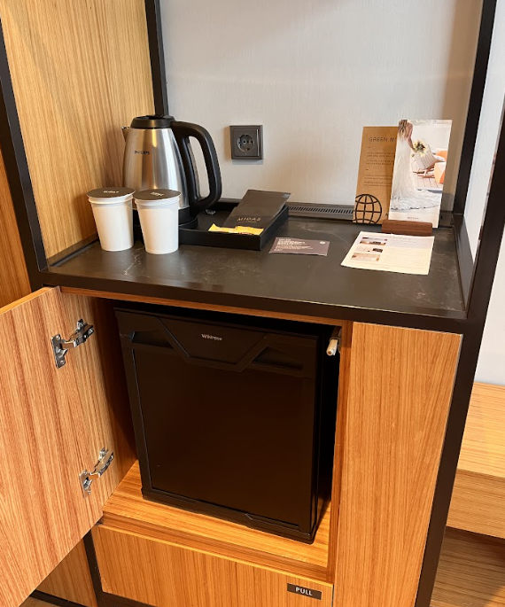 TV와 테이블도 있고, 커피 포트와 물 4병이 들어있네요!