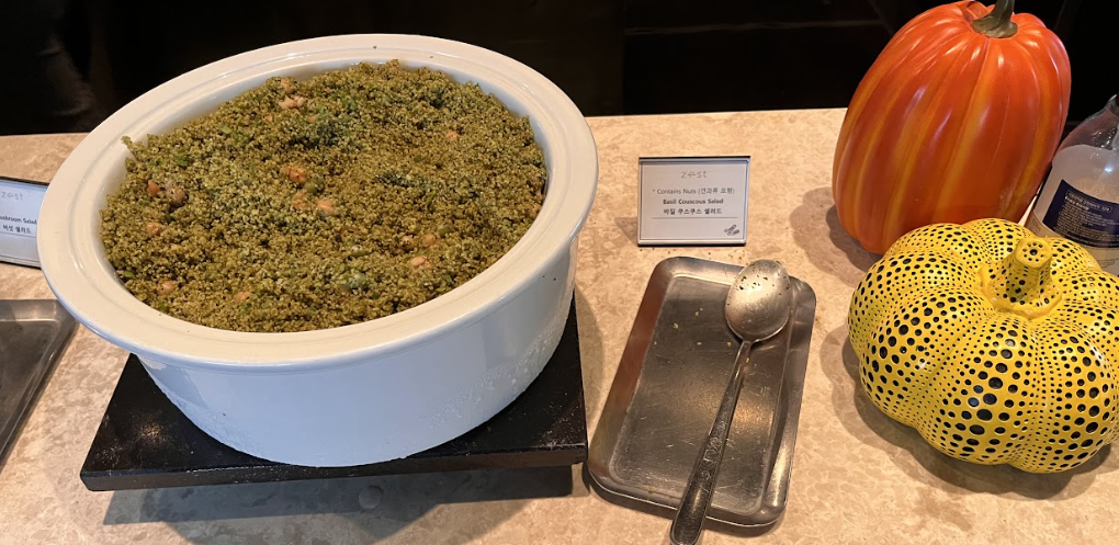 바질 쿠스쿠스 샐러드, 돼지 불고기, 잡채, 만두, 딤섬,