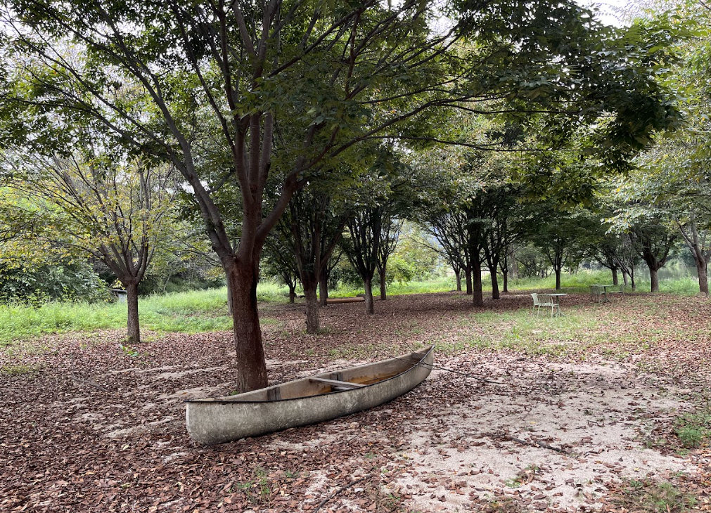 잔디가 넓게 펼쳐져있고 중간 중간 초록 테이블과 나룻배⛵가 놓여있습니다-!