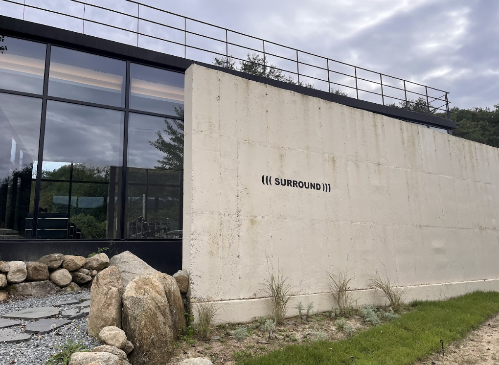 높은 벽에 Surround라고 적혀있고 통 유리창으로 된 외관 모습입니다.