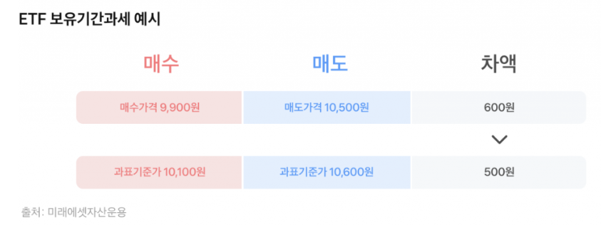ETF 매수시점부터 매도시점까지, 과표기준가의 상승분과 실제 발생한 매매차익 중 적은 금액에 대해 15.4% 원천 징수하고 있으며, 이는 투자자에게 보다 유리하게 세금을 징수하는 정책입니다.