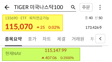 TIGER 미국 나스닥100 창을 보면 현재 NAV와 시장가격이 115,147원 vs 115,070원으로 다른 걸 볼 수 있는데요. 두개의 가격은 어떻게 결정되는 건지 의문이 생기실 겁니다.