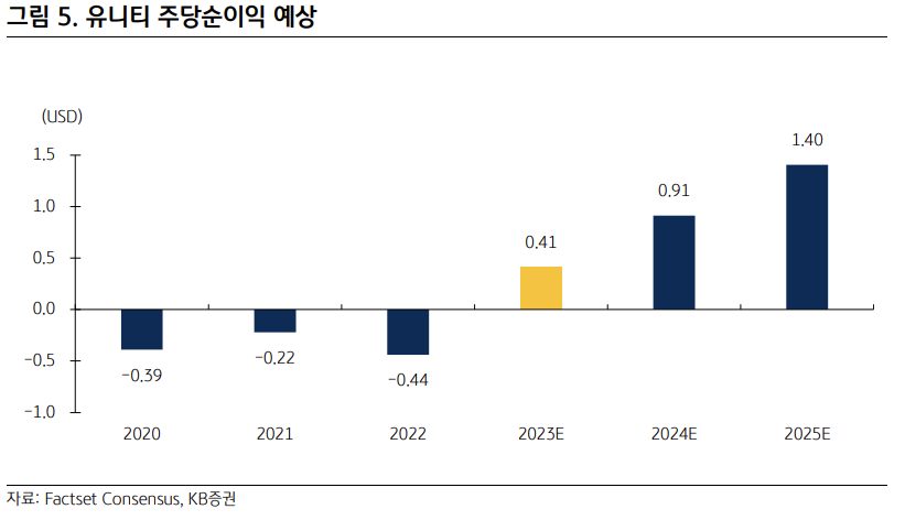 최근 게임 산업 트랜드인 크로프 플랫폼 확대, 모바일 게임 성장, 게임의 소셜화 방향이 모두 유니티의 성장에 긍정적으로 작용할 것으로 전망됩니다. 플랫폼 간 자유로운 전환을 기본으로 하는 클라우드 게이밍 서비스의 본격화와 함께 크로스 플랫폼 형태의 개발이 주류로 부상했으며, 이는 서드파티 엔진을 활용하는 유니티에는 긍정적으로 작용하고 있습니다. 또한 최근 7월 애플이 MR 기기 비전 프로를 공개하며 유니티와의 협력 사실을 밝혀 주목받고 있습니다. 비전 프로 상에서 유니티의 소프트웨어를 이용해 3D 이미지를 실시간으로 AR 환경에 구현하고, 편집할 수 있다는 특징이 있습니다. 유니티 엔진을 활용하는 주요 게임 리스트로는 포켓몬 고, 어몽 어스, 폴 가이즈 등이 있습니다. 유니티의 고객 수는 12,269이며, 게임 개발 분야 Market Share는 29.4%로 1위를 차지하고 있습니다. 유니티의 티커는 U이며, 현재 주가는 28불로 시가총액 $10.75B를 기록하고 있습니다. 유니티의 주당 순이익은 2023년부터 흑자로 돌아설 것으로 전망되며 AI에 대한 기대감도 유효하여 앞으로 기업 가치는 더욱 높아질 것으로 전망됩니다.