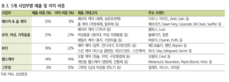 P&G (Procter & Gamble Company)는 1950년에 상장한 화장품, 세면용품 등 글로벌 필수 소비재 1위 회사입니다. 프록터&갬블은 1893년 비누, 캔들 제조 사업으로 시작하였으며, 현재는 미용용품, 식음료, 건강용품, 세면용품 등 다양한 제품으로 사업을 확장하며 성장하고 있습니다. P&G는 10개 카테고리 65개 브랜드를 가지고 180여개 국가에 필수 소비재로 자리 잡고 있습니다. 대표 브랜드로는 비너스, 헤드앤숄더, SK-Ⅱ, 질레트, 다우니, 팬틴, 브라운 등이 있습니다. 사업 부문별 매출 비중을 살펴보면 패브릭 & 홈케어 분야가 34%, 유아 & 여성 & 패밀리 케어 분야가 24%, 뷰티 분야가 20%, 헬스케어 분야는 13%로 구성되고 있습니다. 지역별 매출 비중은 북미가 47%, 유럽은 22%, 중국 10%, 아시아 9%로 선진국 중심의 브랜드 선호도가 돋보이고 있습니다. P&G는 대표적인 경기 방어주이며, 코로나 동안 위생용품 수요 증가로 혜택을 받았습니다. P&G는 생활의 필수적인 소비재를 판매하기 때문에, 경기 상황에 상관없이 안정적으로 실적을 내고 있습니다. 또한, 미국 시장 내에서 여성용품, 세탁제, 칫솔, 섬유유연제 등에서 모두 시장 점유율 1위를 달성하며 소비자의 일상을 장악하고 있습니다. 인터브랜드의 글로벌 Top 100 브랜드 중 P&G의 브랜드 Pampers, Gillette 2개가 당당히 순위를 차지하고 있습니다. 개별 제품의 브랜드 가치가 P&G의 장기 성장의 주요 축으로 작용하고 있습니다.