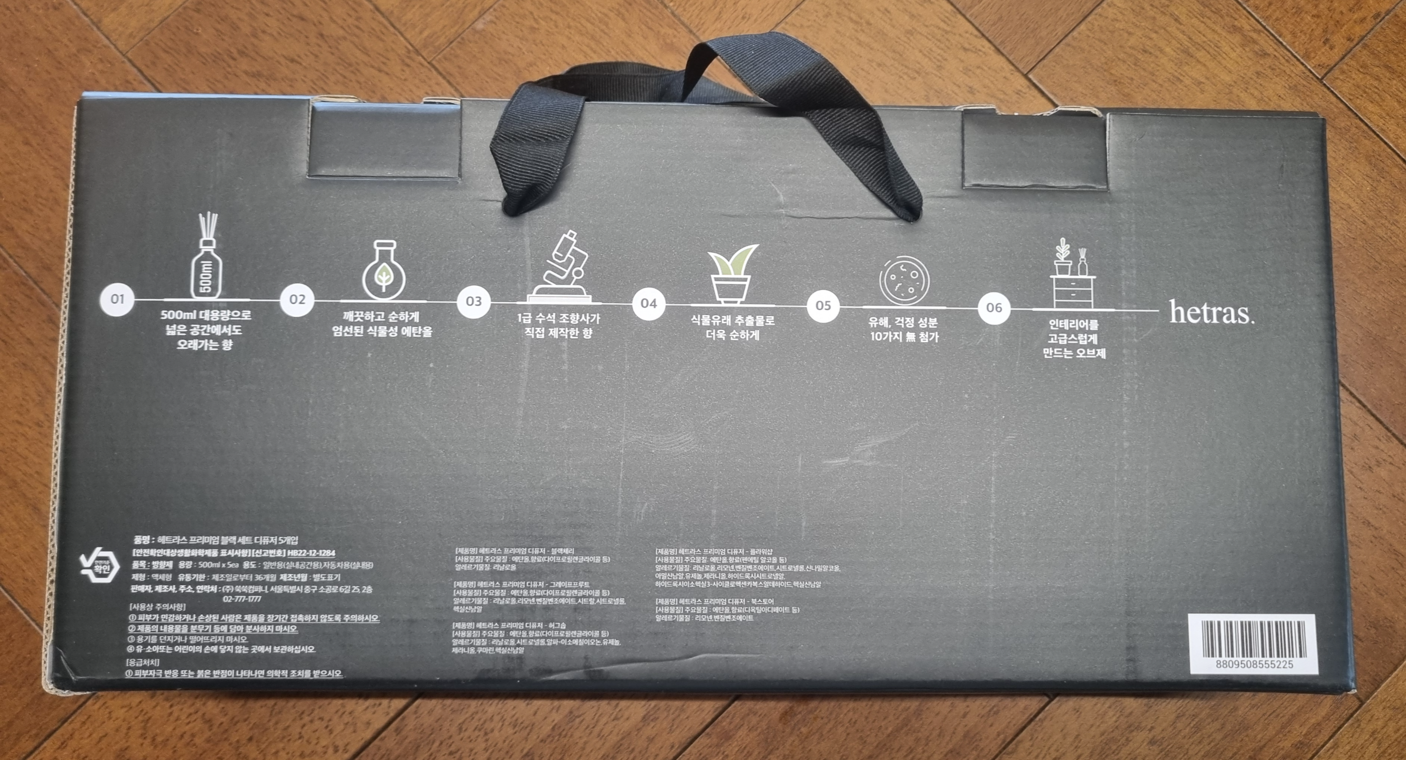 박스 뒷면에는 hetras 디퓨져에 대한 설명이 적혀 있습니다.