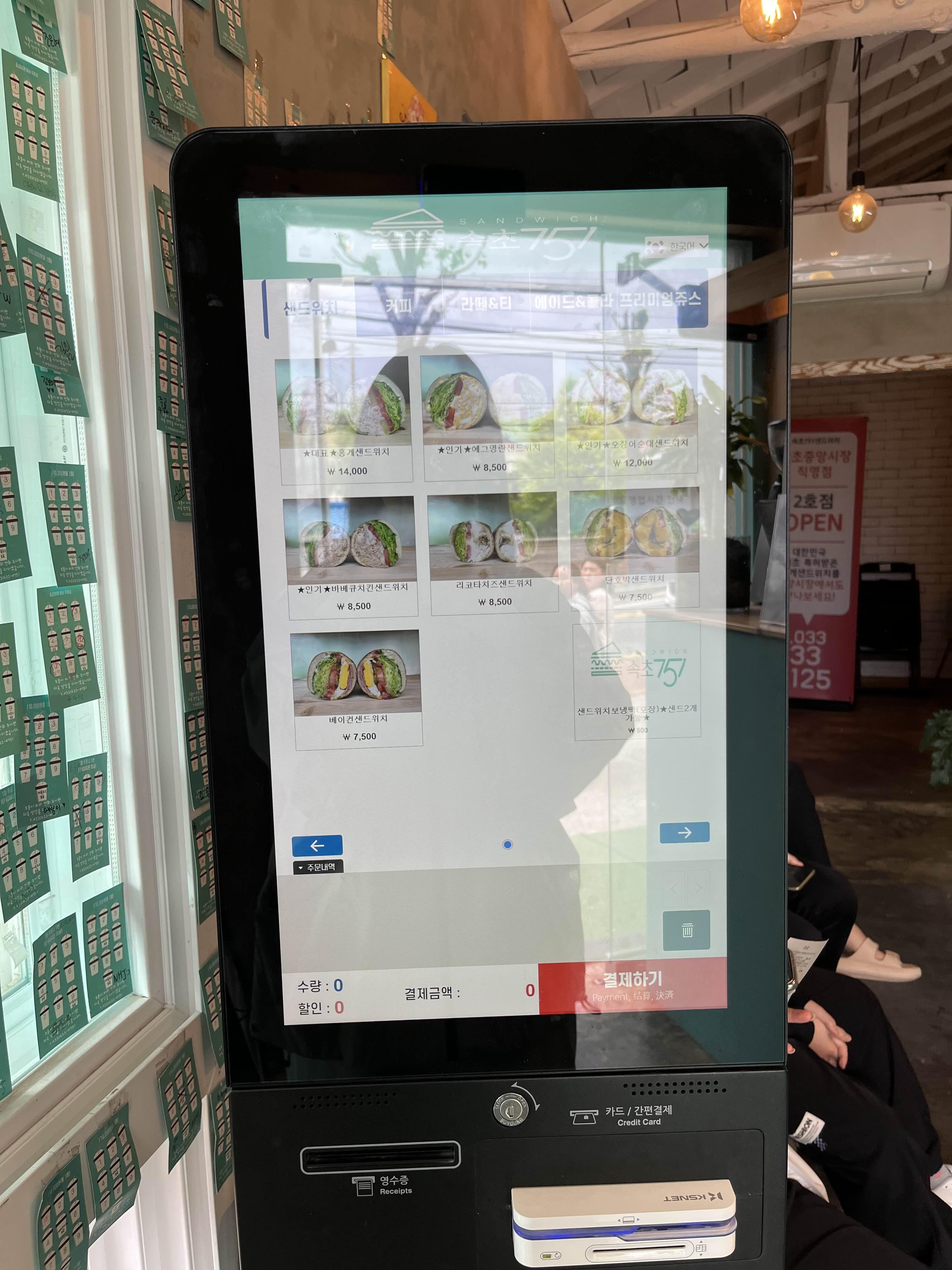 키오스크에서 주문하는 방식이고 저희는 대표매뉴인 홍게 샌드위치와, 단호박 샌드위치를 주문했습니다.