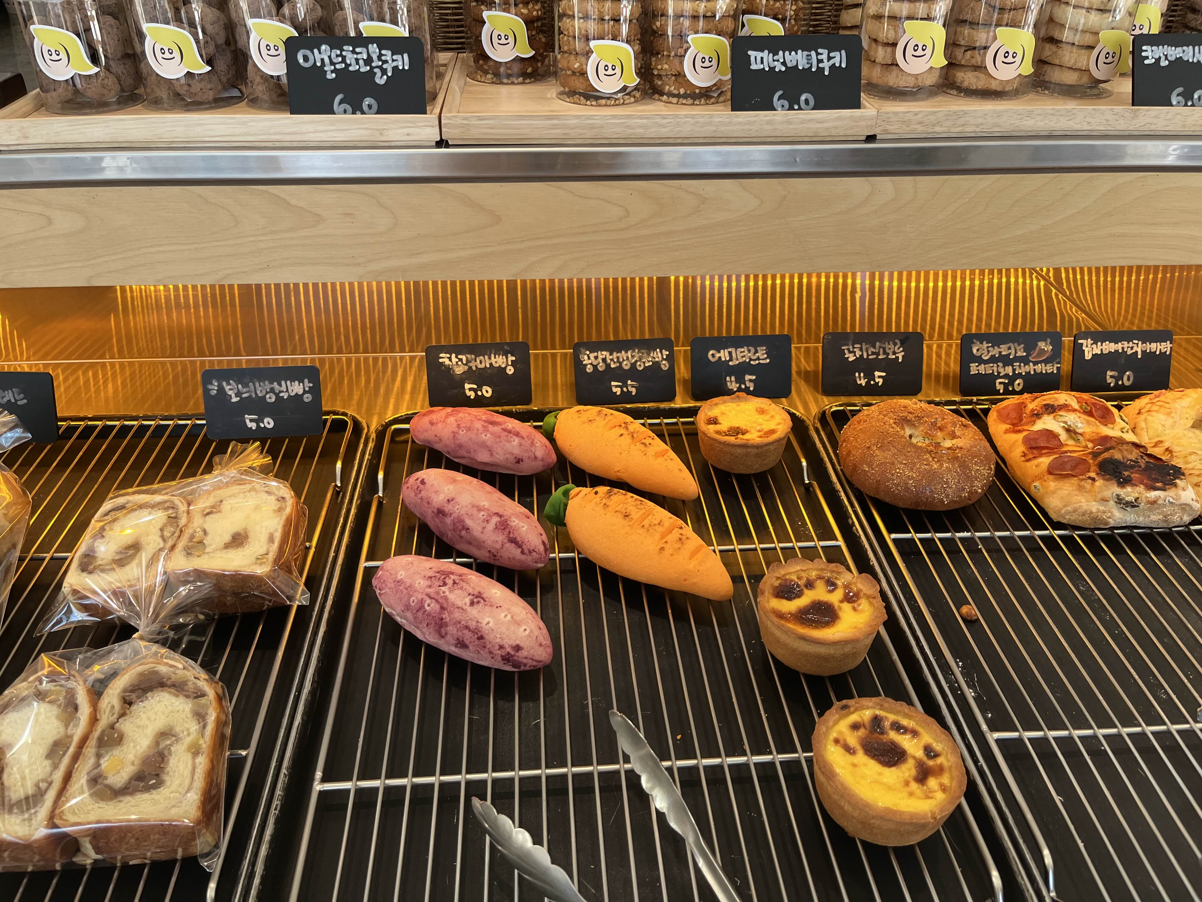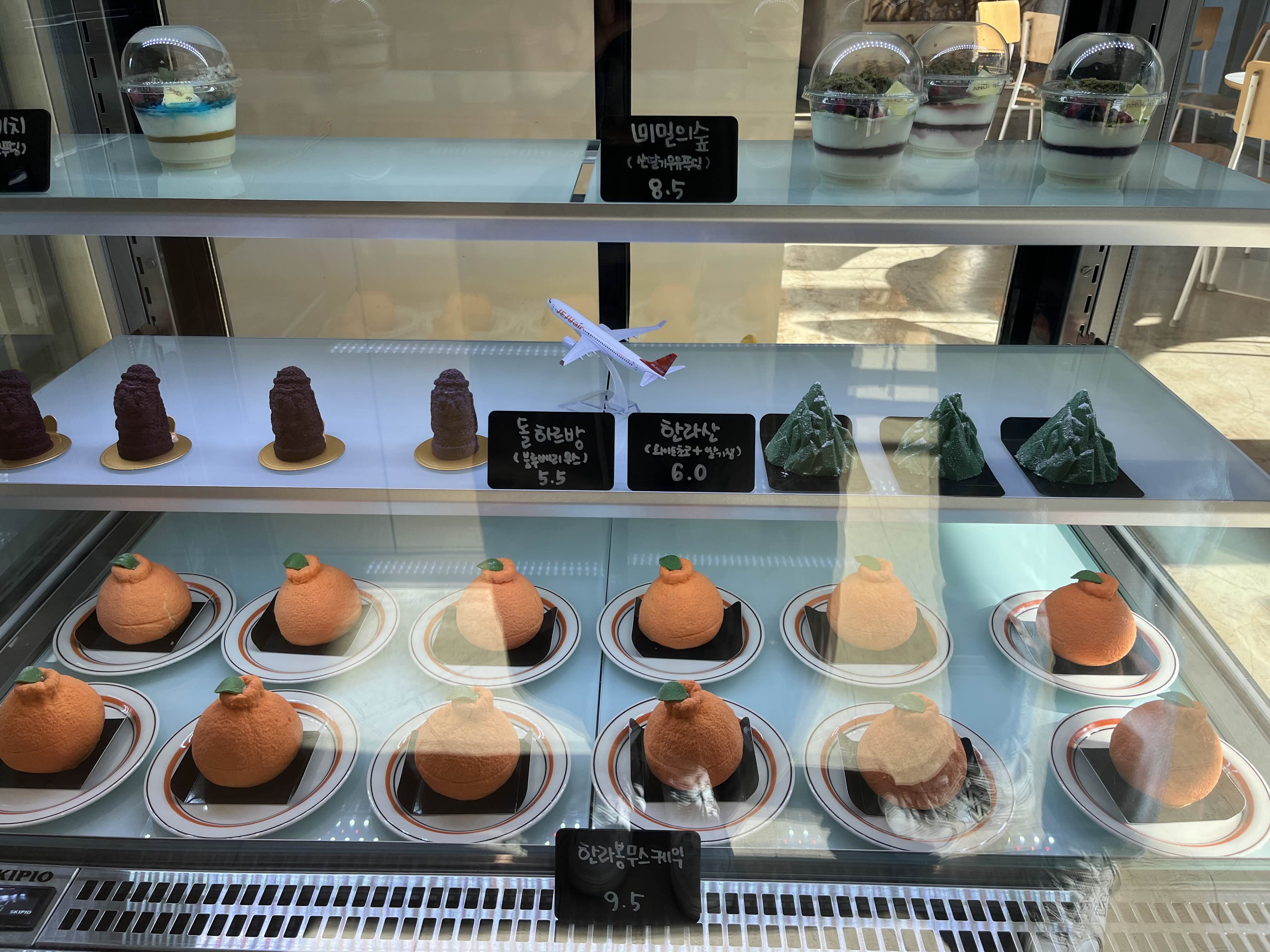 커피 외에도 한라봉, 돌하르방, 한라산 모양의 귀여운 무스 케이크부터 크루와상, 바게트, 스콘, 에끌레어 등