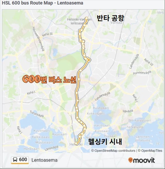 - Lentoasema 정류장 → 600번 버스 → Rautatientori 정류장 : 24개 정류장, 약 42분 소요