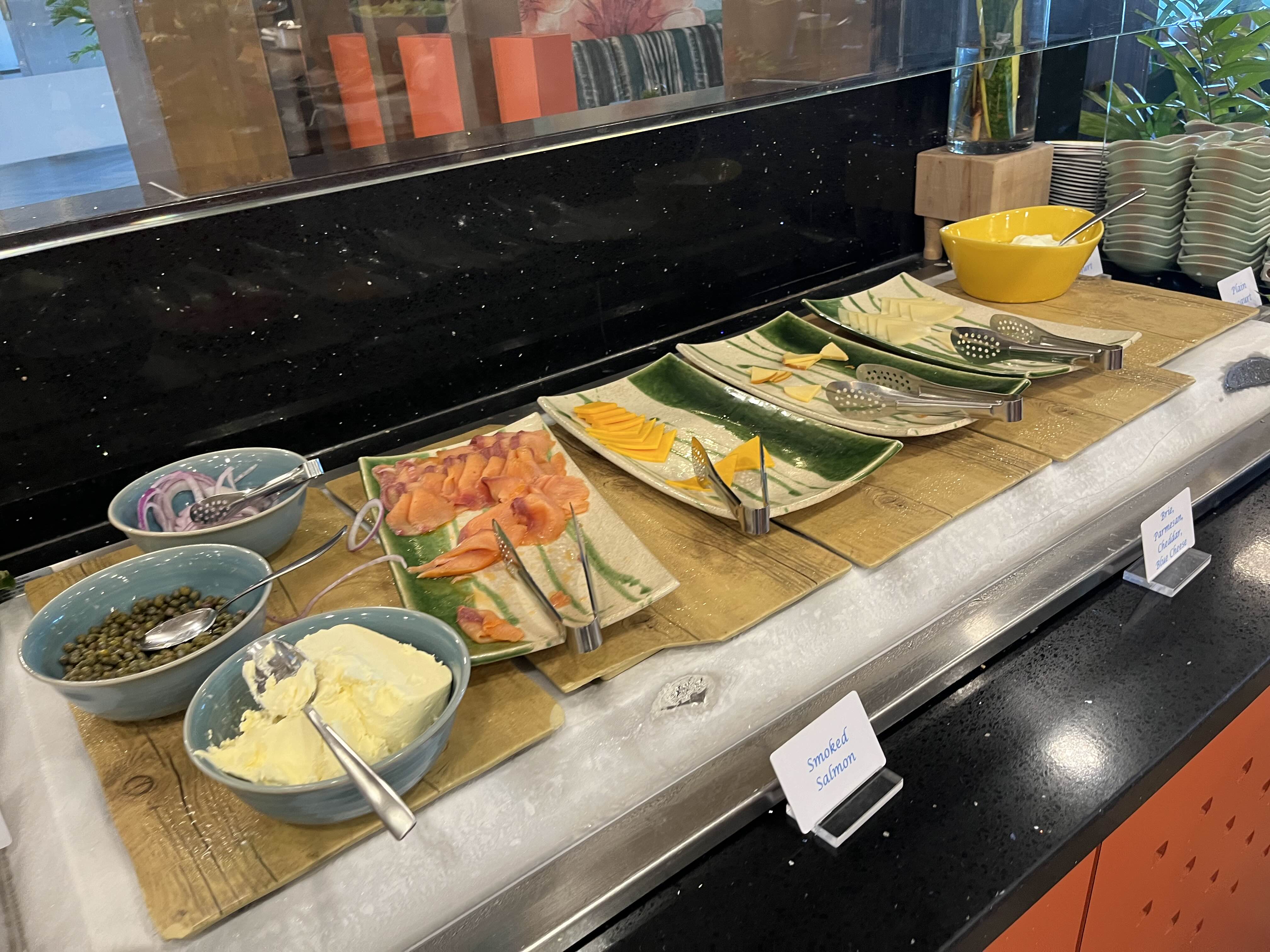 빵 옆에는 연어와 치즈 코너가 마련되어 있습니다.