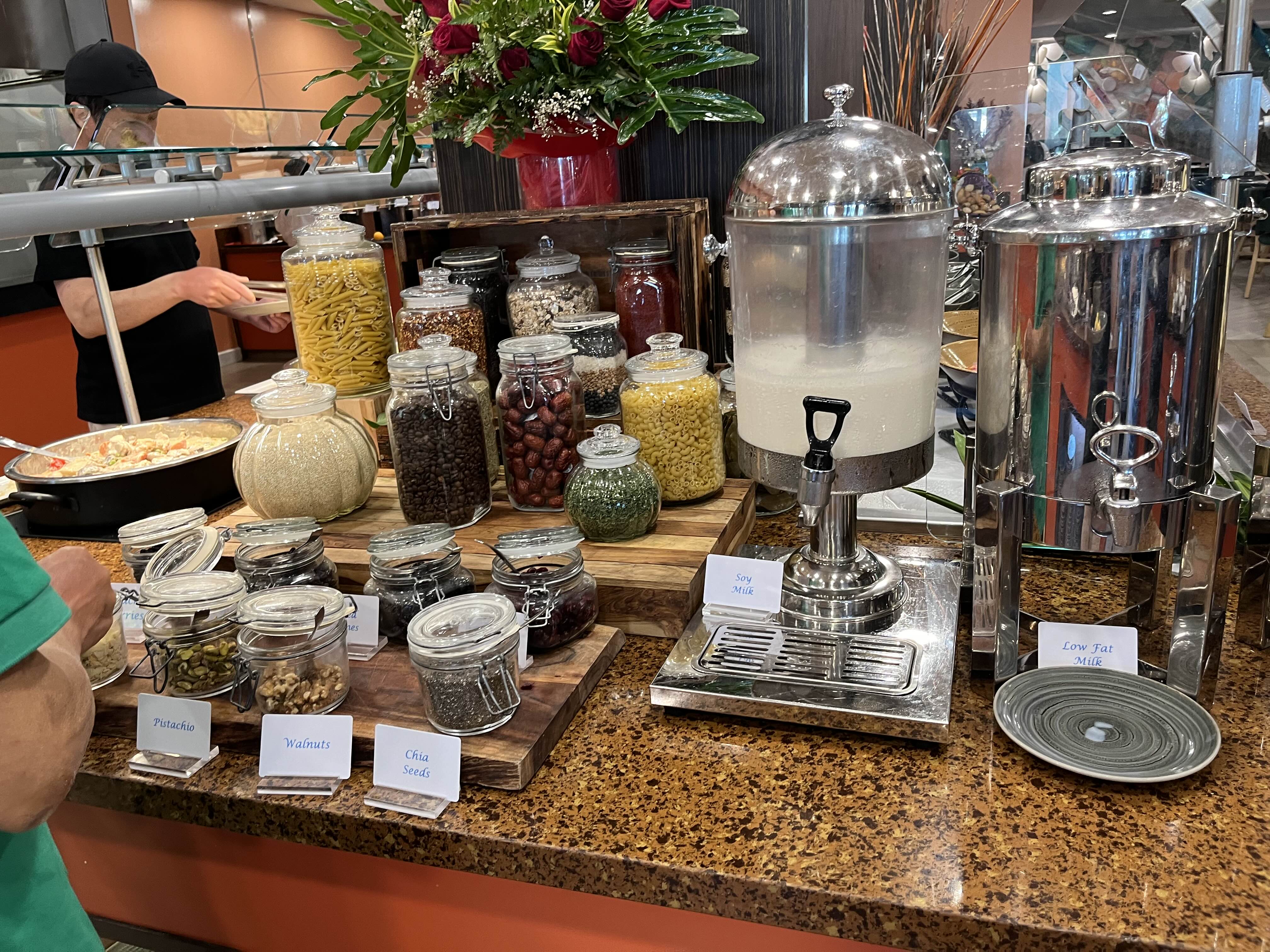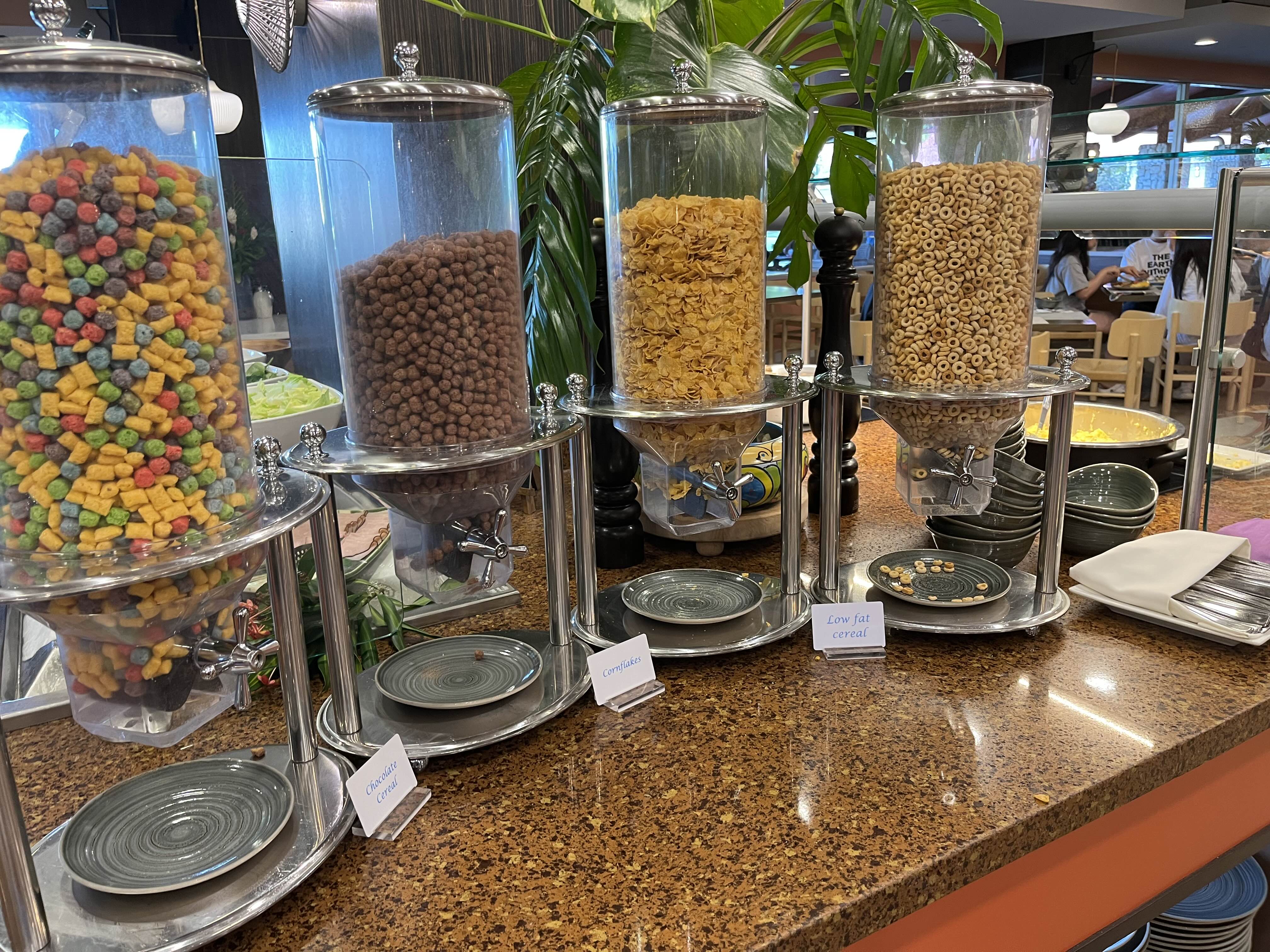 시리얼 코너도 있고 저지방 우유와 두유, 아몬드 밀크도 준비되어 있습니다.