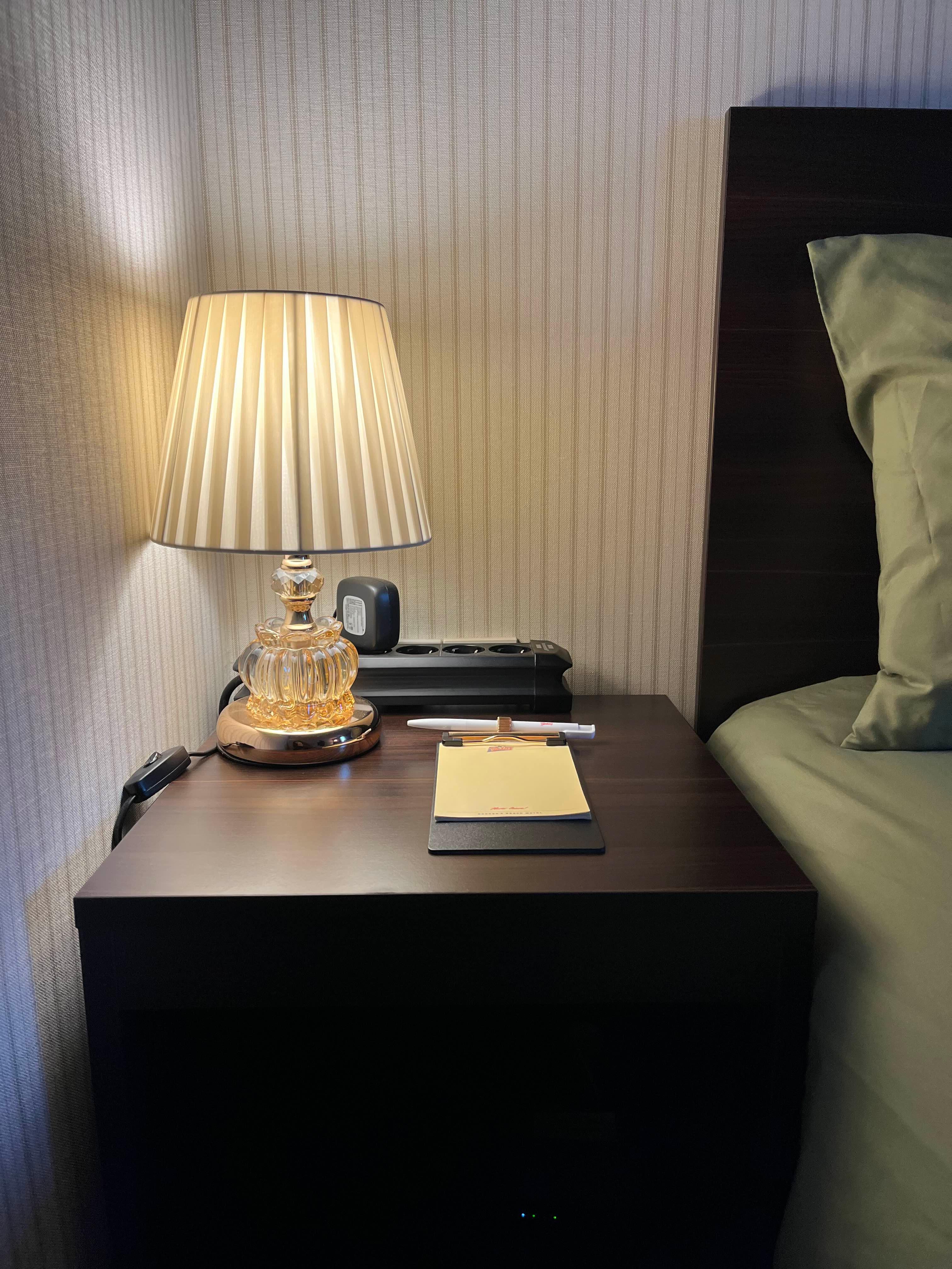 침대 옆에는 예쁜 조명과 간단한 메모지, 콘센트도 있었습니다.