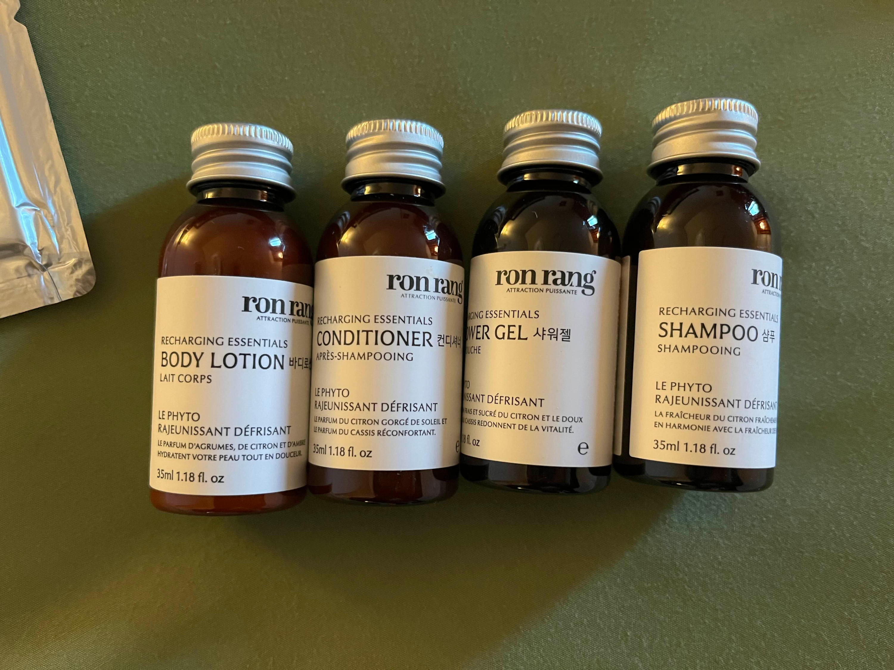 어메니티는 귀여운 약병 같은 병에 들어 있었고 샴푸, 컨디셔너, 바디워시, 비다로션, 바디 타월이 준비되어 있습니다.