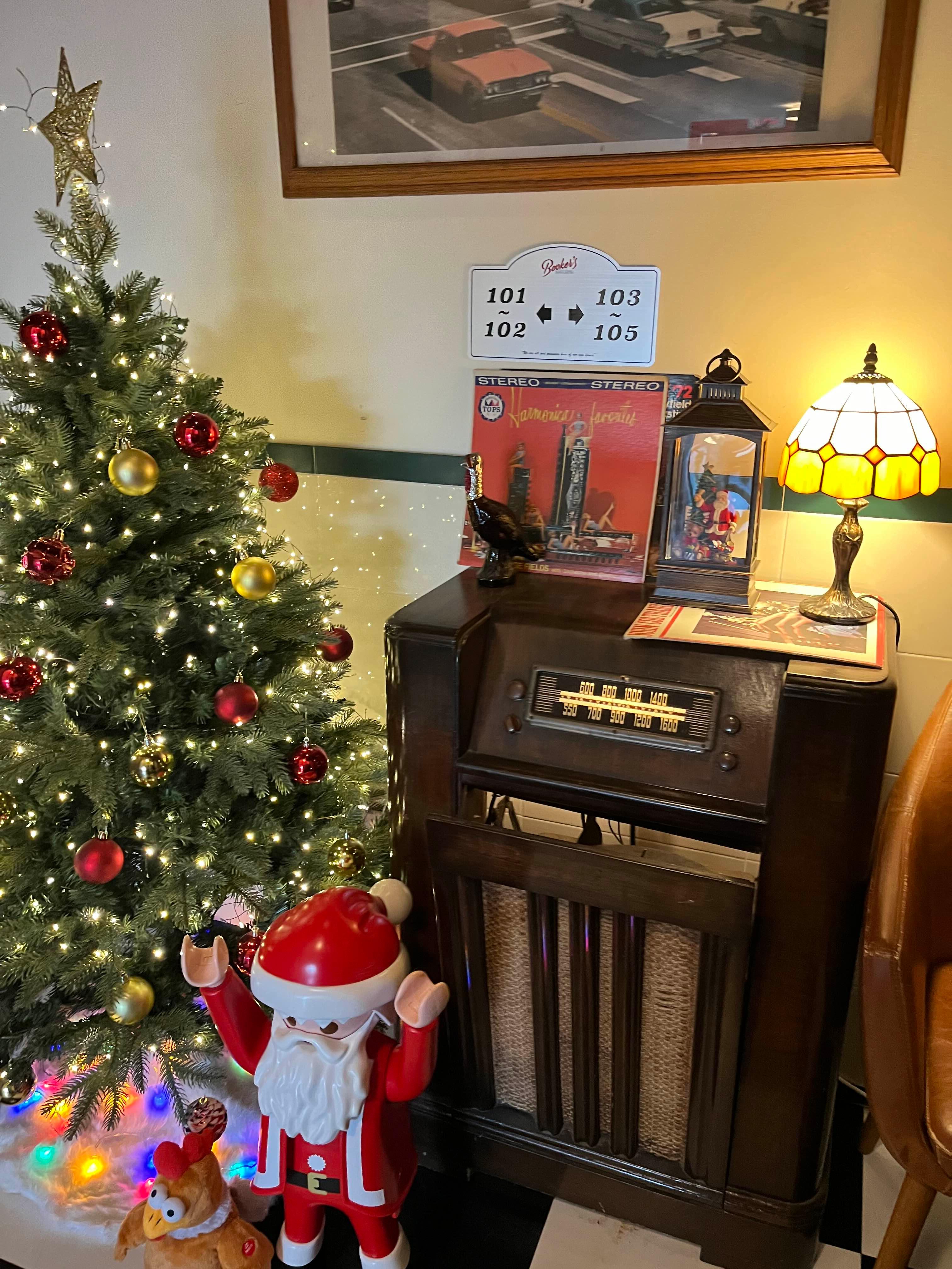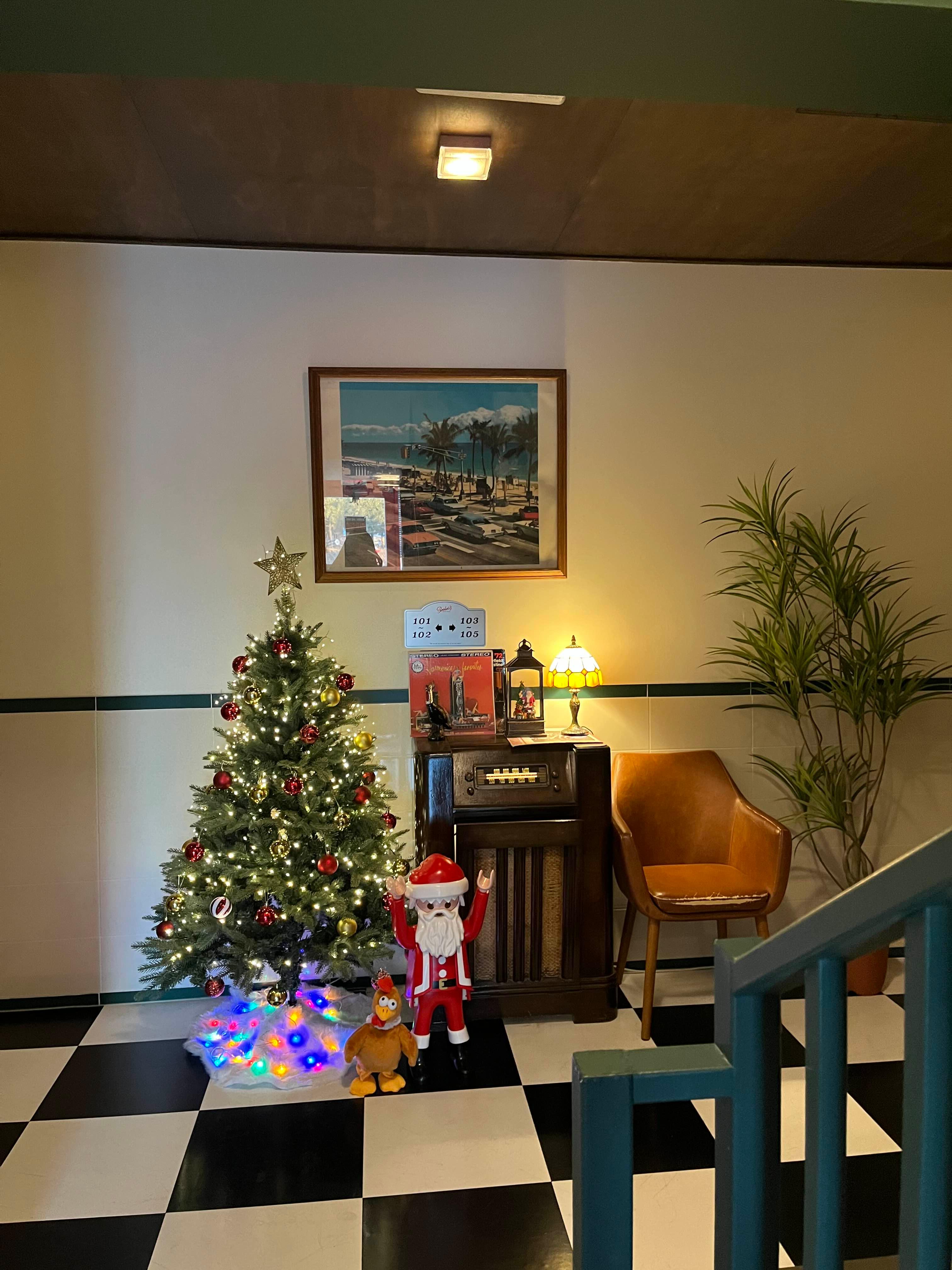 로비에는 크리스마스 트리와 치킨 인형 친구가 보이네요.
