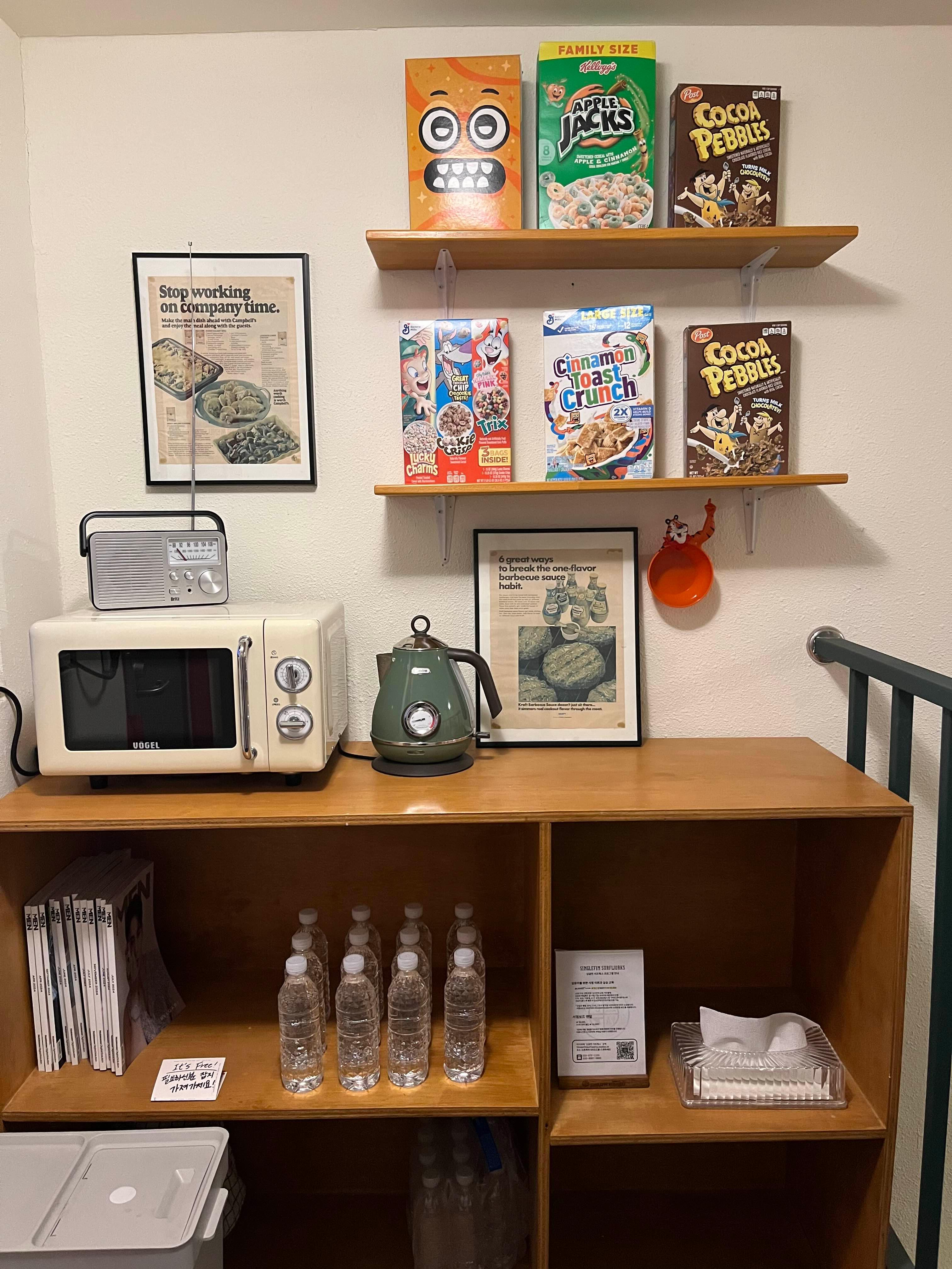 3층에는 잡지와 커피포트, 전자레인지가 있어서 간단히 라면을 먹거나 음식을 데울 수 있습니다 : )