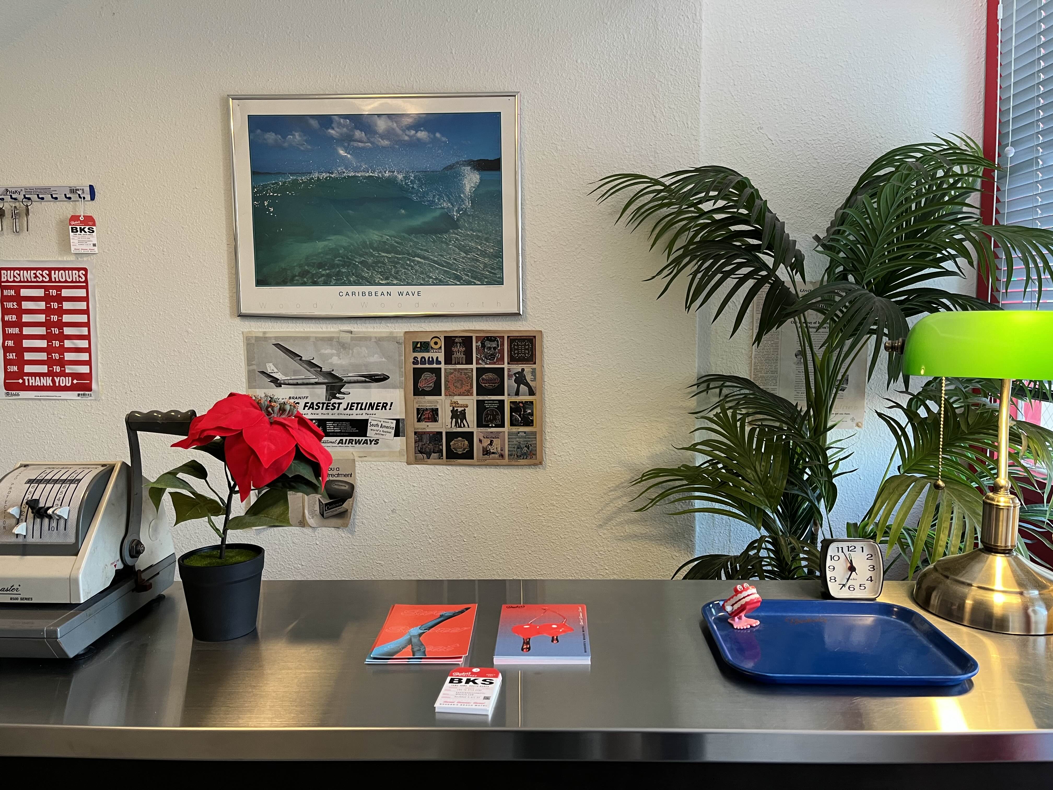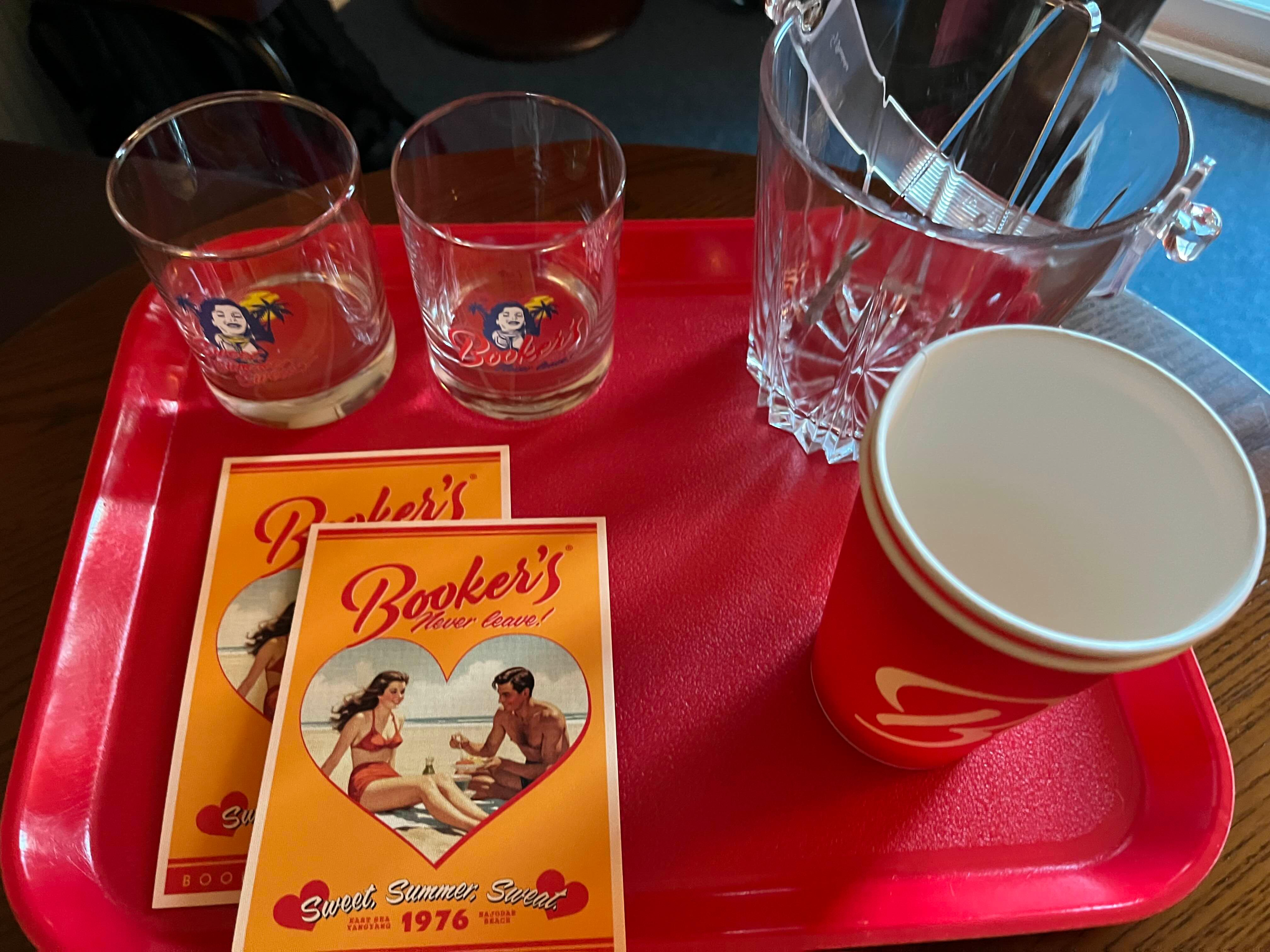 책상에는 감각적인 포스터와 컵, 아이스 버켓이 마련되어 있습니다.