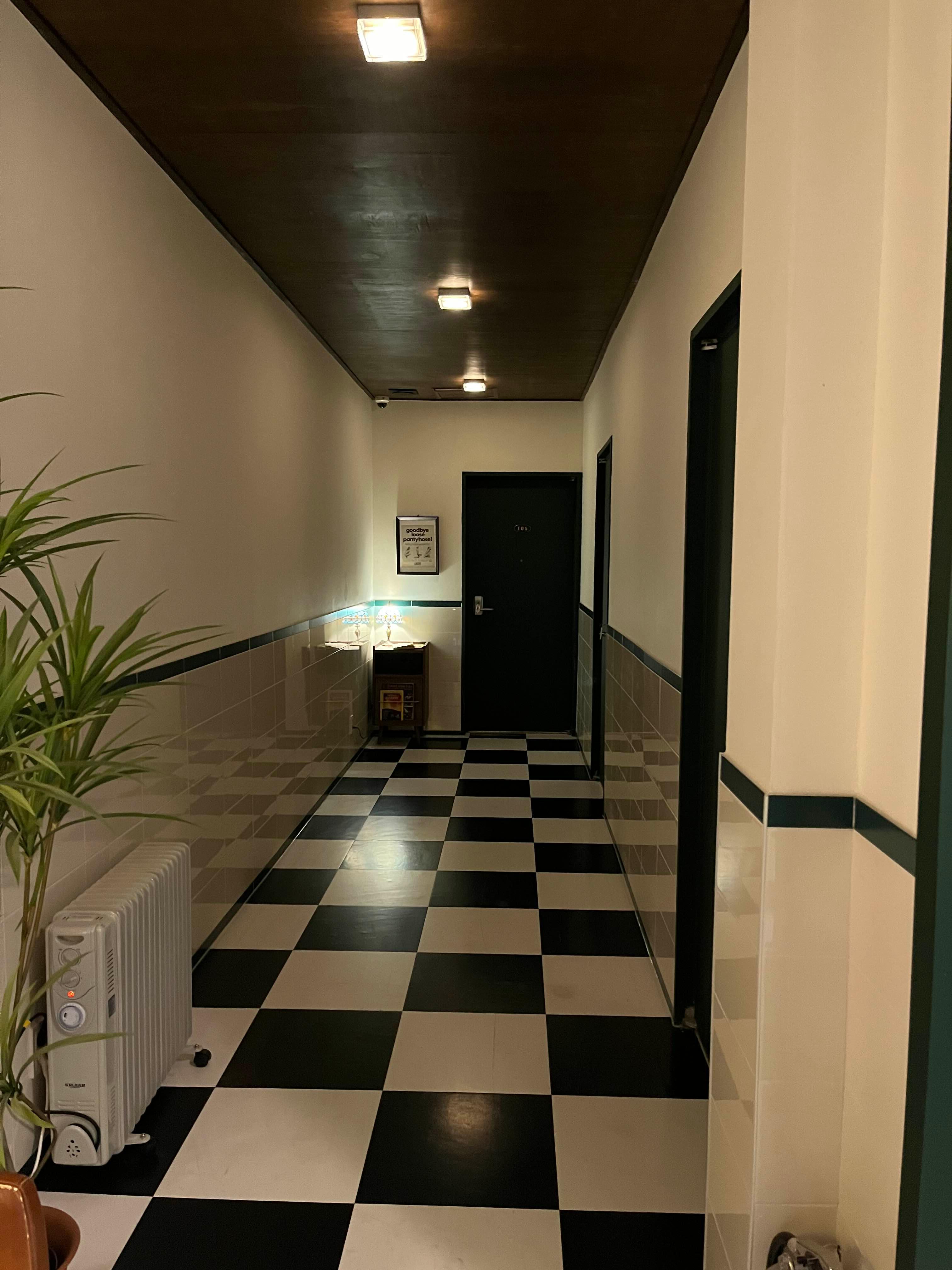 1층에는 5개의 숙소로 구성되어 있습니다. 근데, 바닥 체크무니가 정말 이색적이지 않나요?