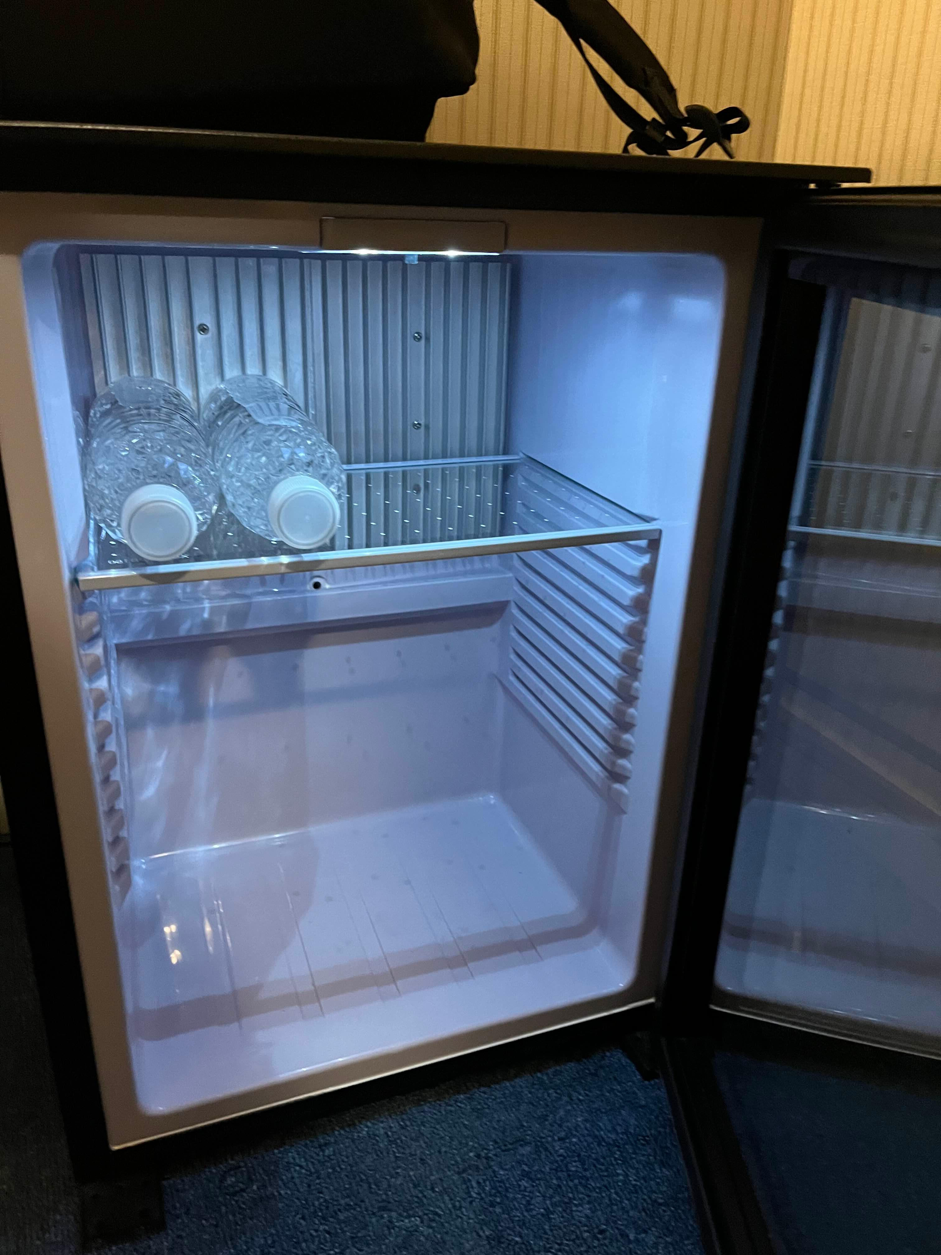 방에는 미니 냉장고가 있고 물이 2개 들어있습니다.