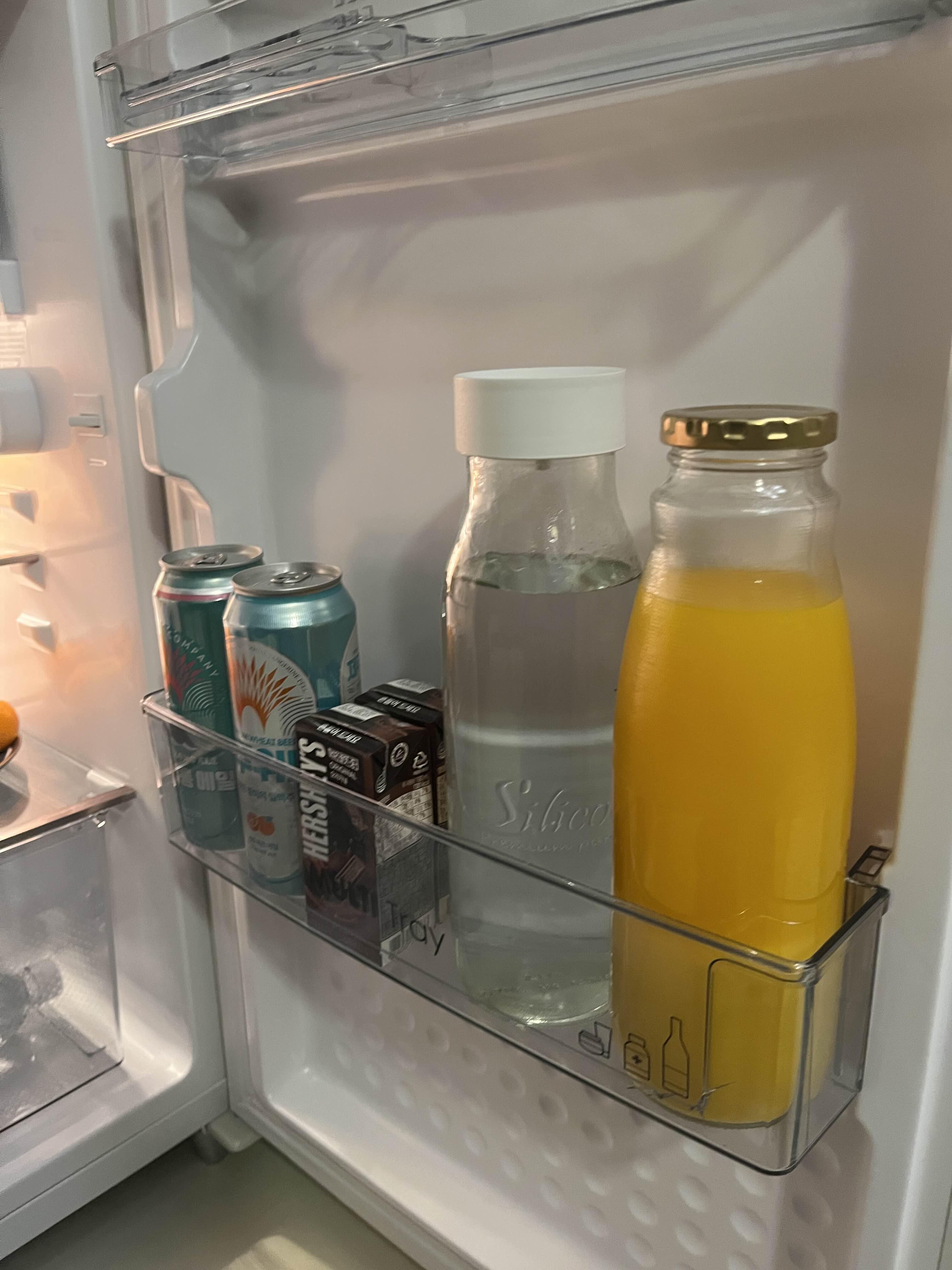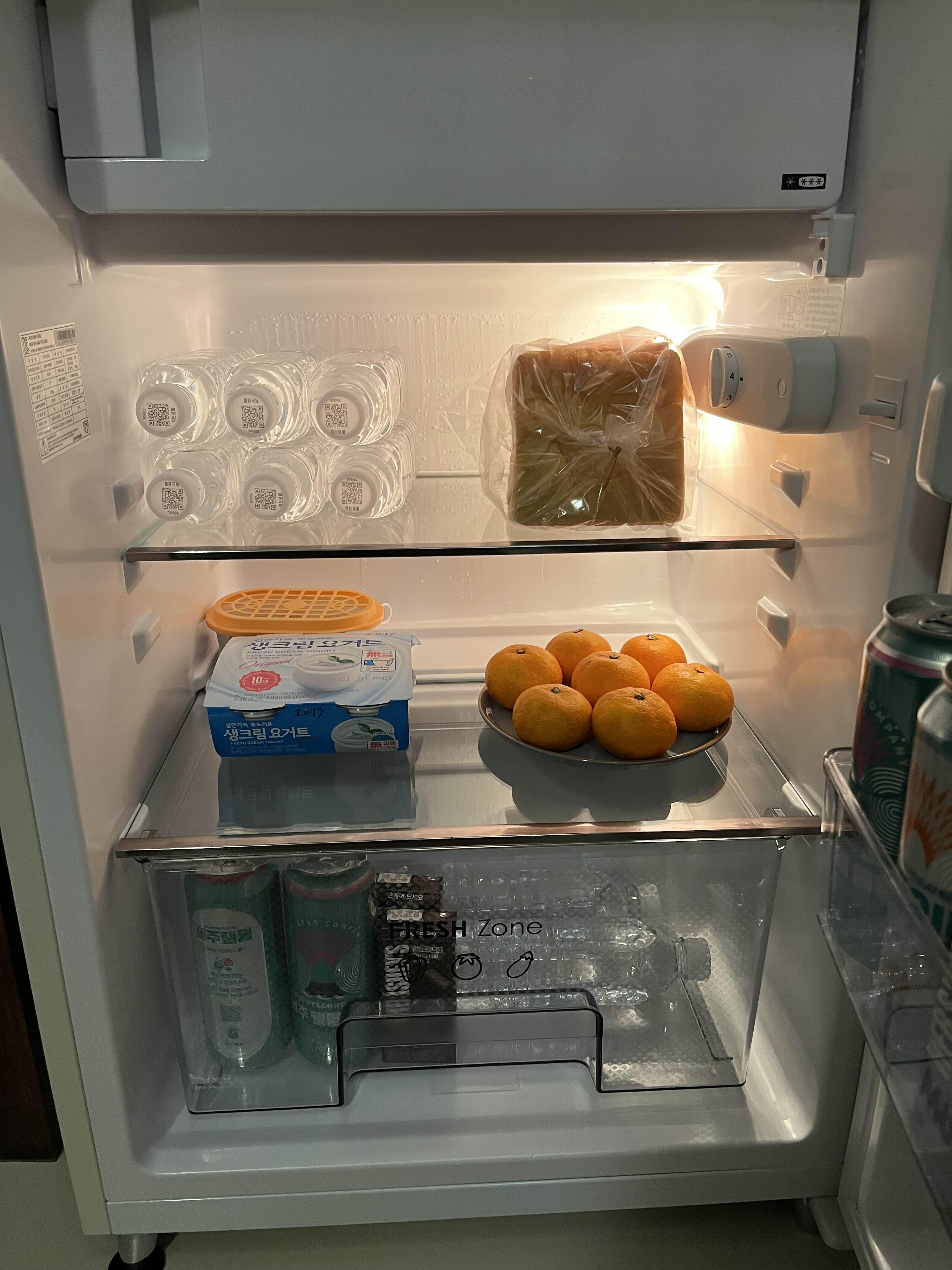 냉장고에는 조식으로 감귤, 오렌지 주스, 요거트, 식빵, 맥주, 물, 초코 우유, 잼까지 정말 다양한 먹을거리가 준비되어 있더라구요. 사장님의 센스가 돋보이는 점이에요.