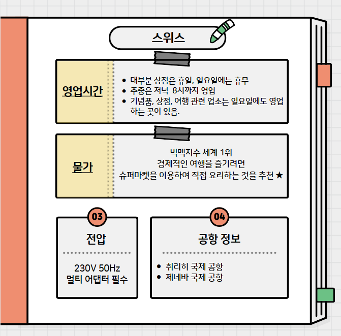 | [Checklist] 스위스 여행 필수 준비물 (0) | 2023.11.27 |