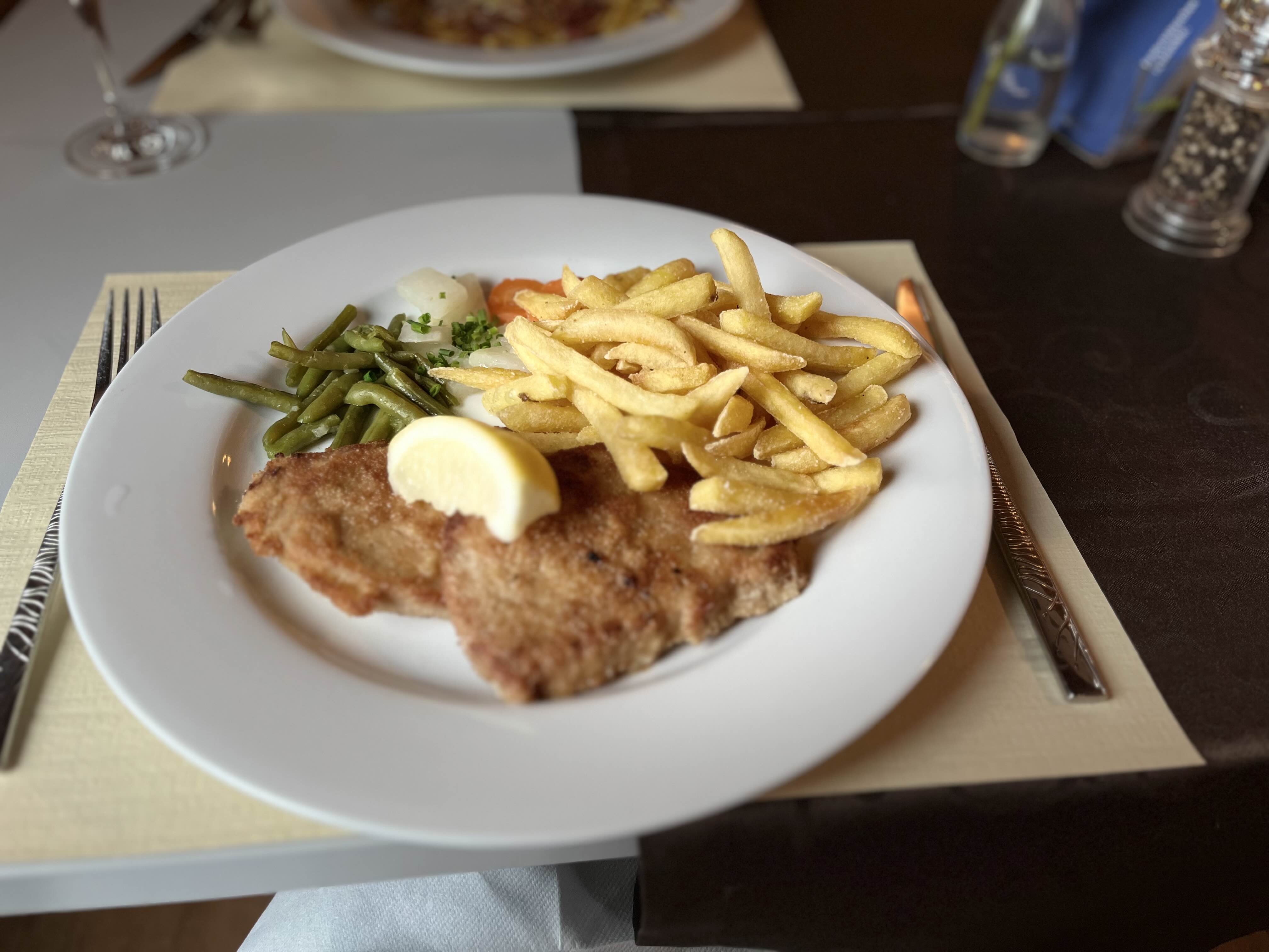 이건 슈니첼! 감자 튀김이 같이 나오는 송아지 고기 돈까스로 한국의 돈까스와 비슷한 맛이었다.