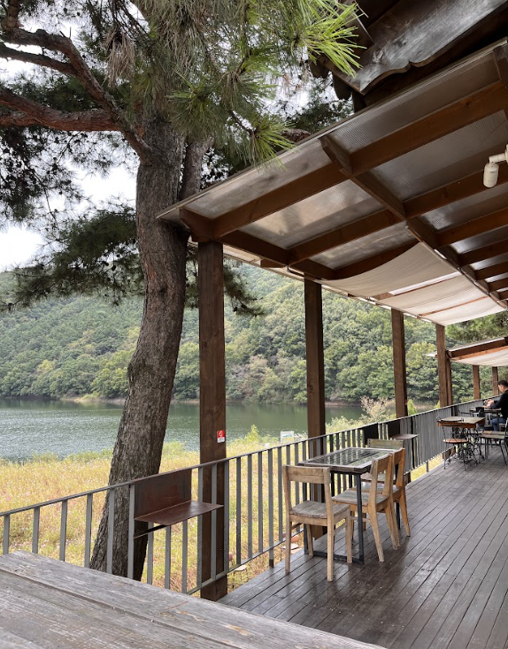 데크에는 호수를 보며 커피를 마실 수 있는 공간도 마련되어 있네요 : ㅇ