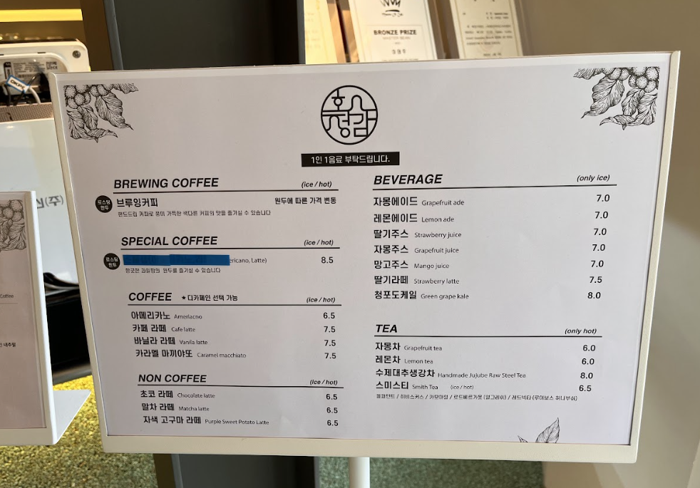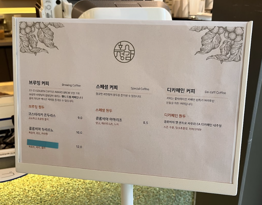메뉴는 브루잉 커피☕와 일반 커피, TEA, 각종 음료 🧉 가 있고