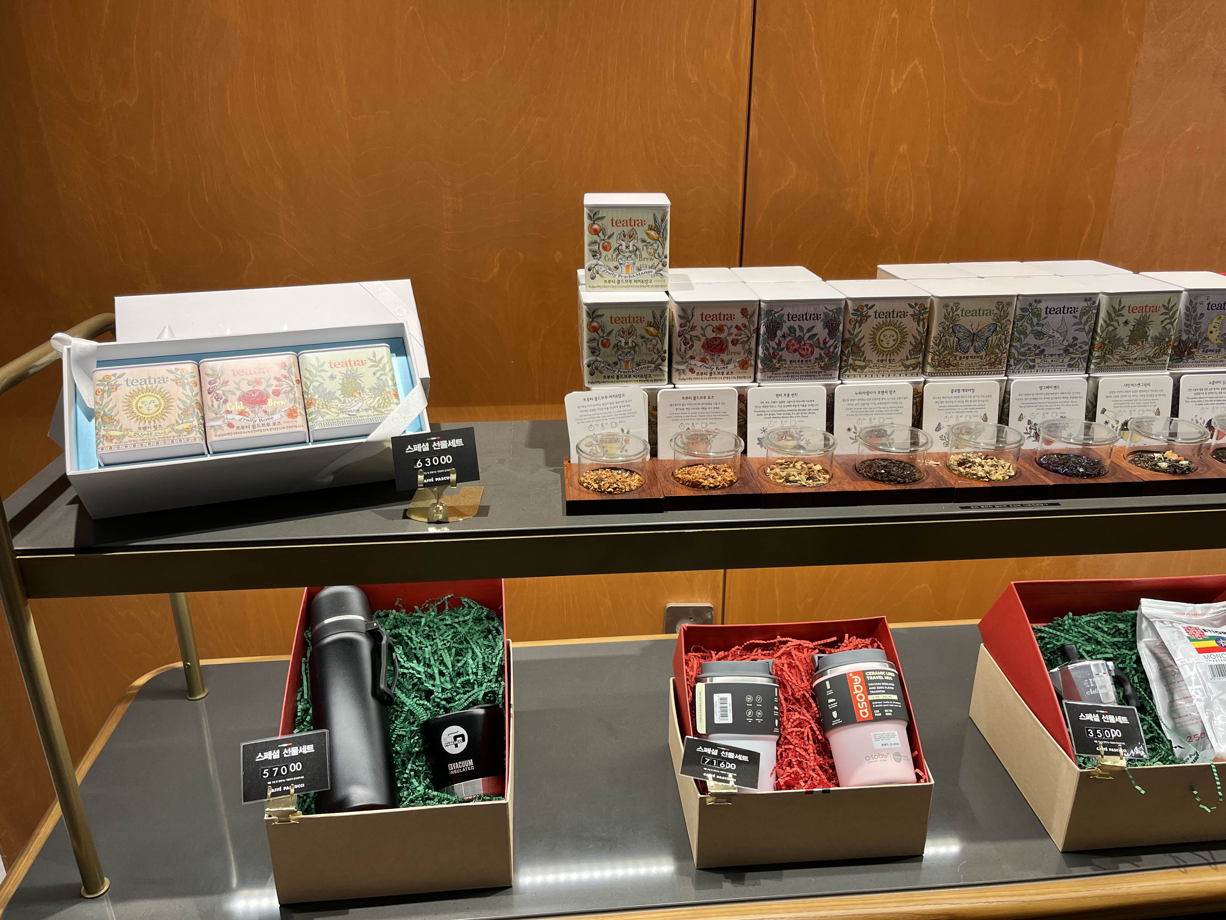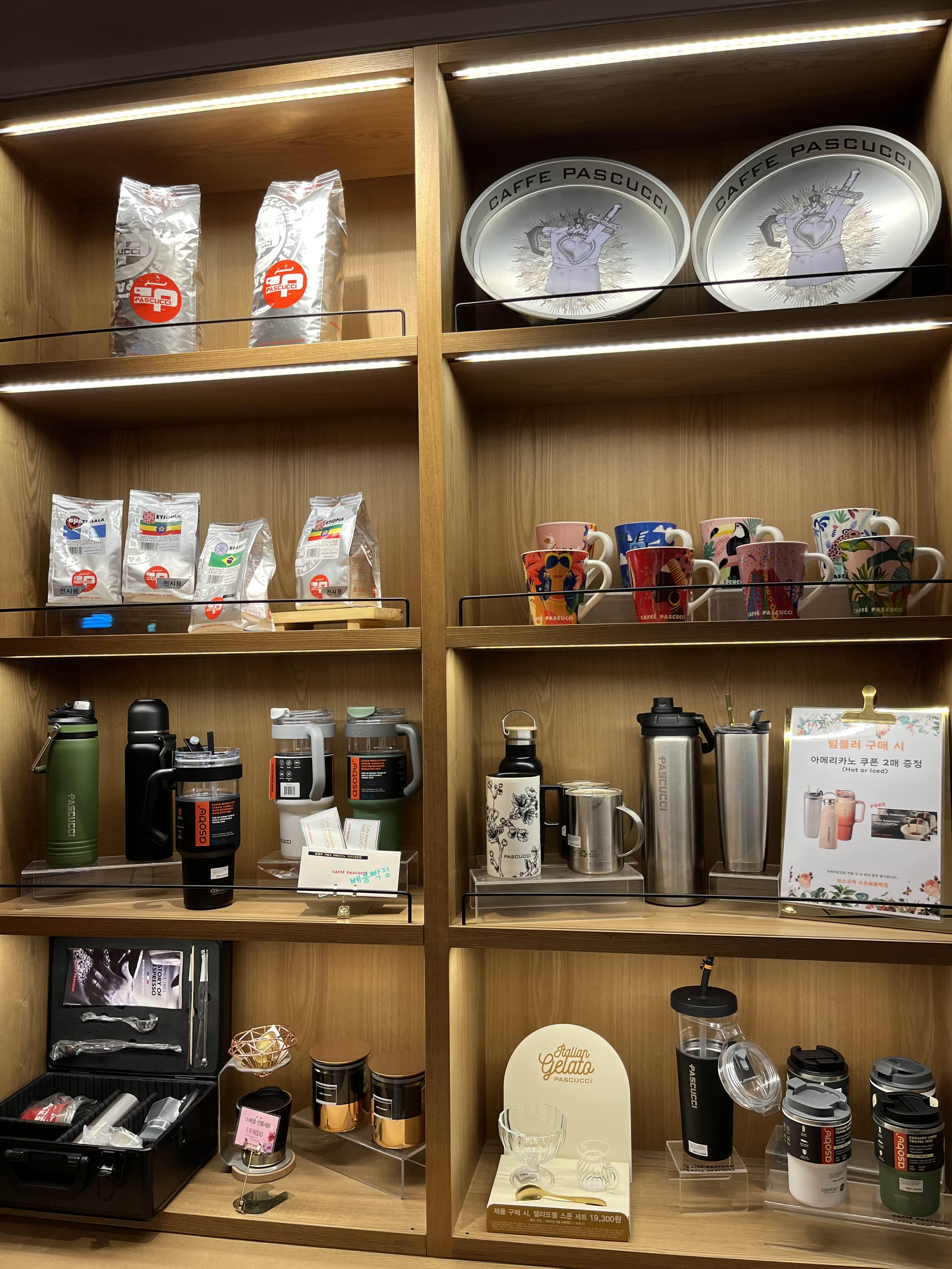 카페 한쪽에는 다양한 컵과 커피, 티, 와인을 판매하고 있습니다.