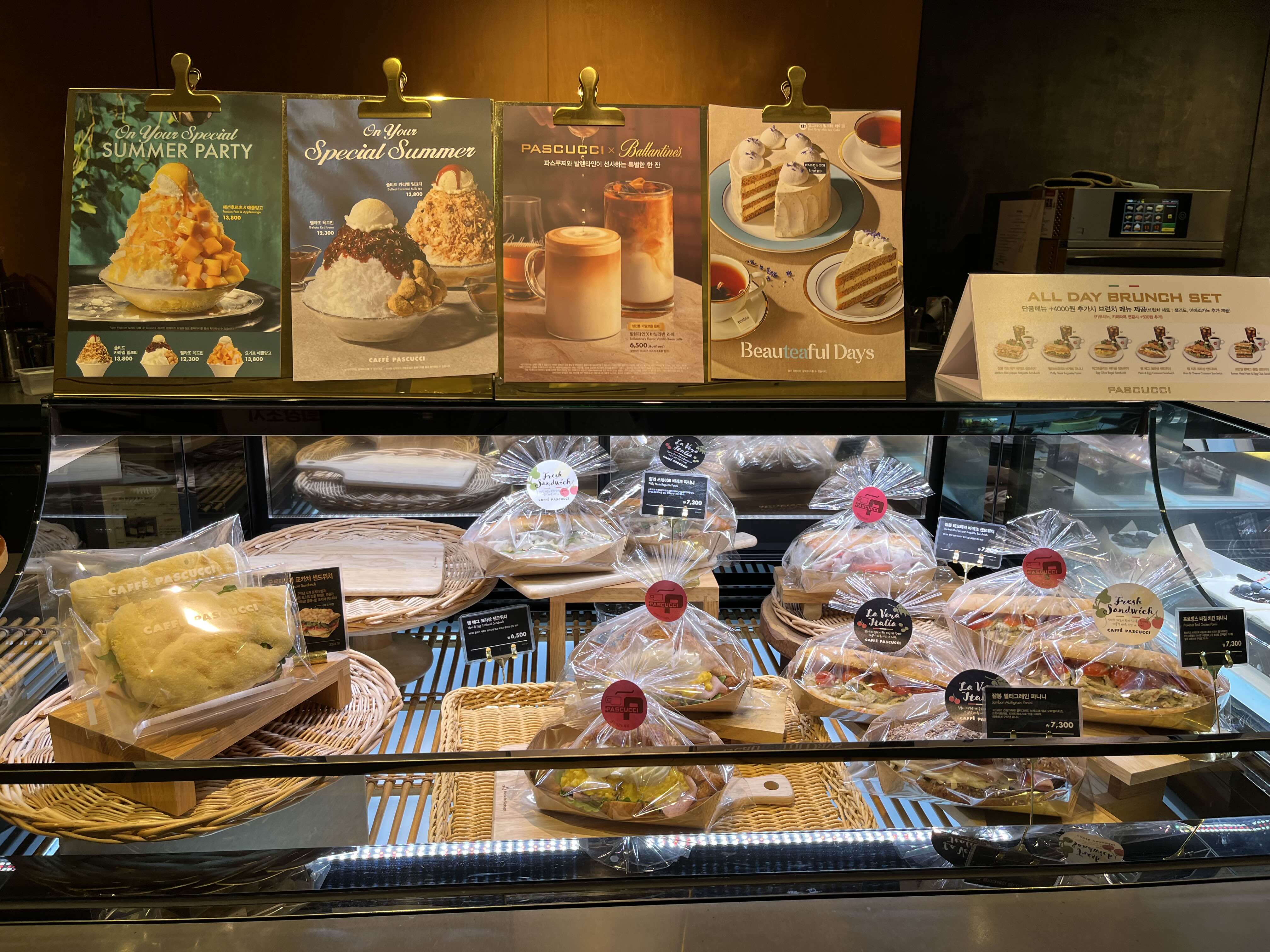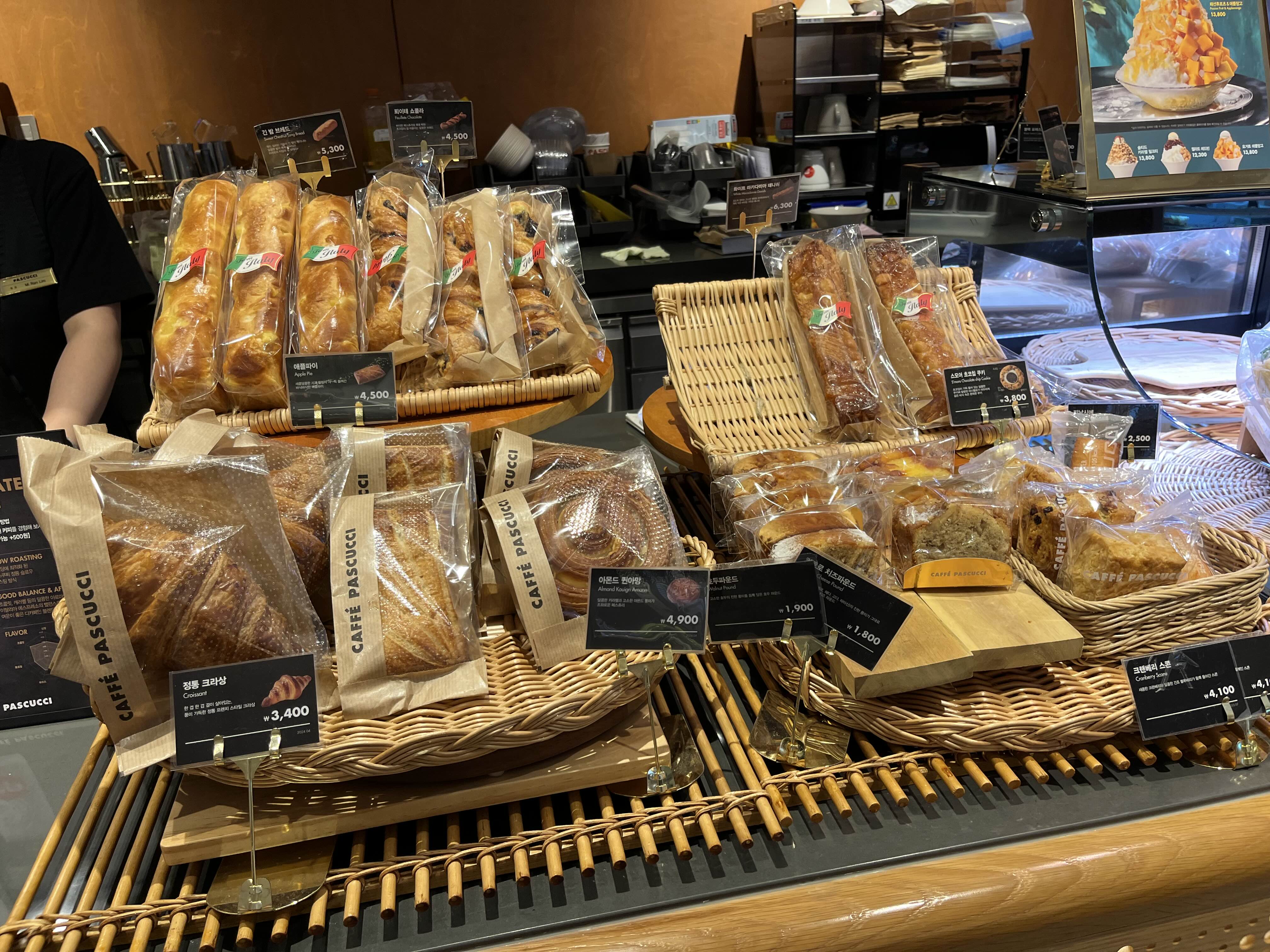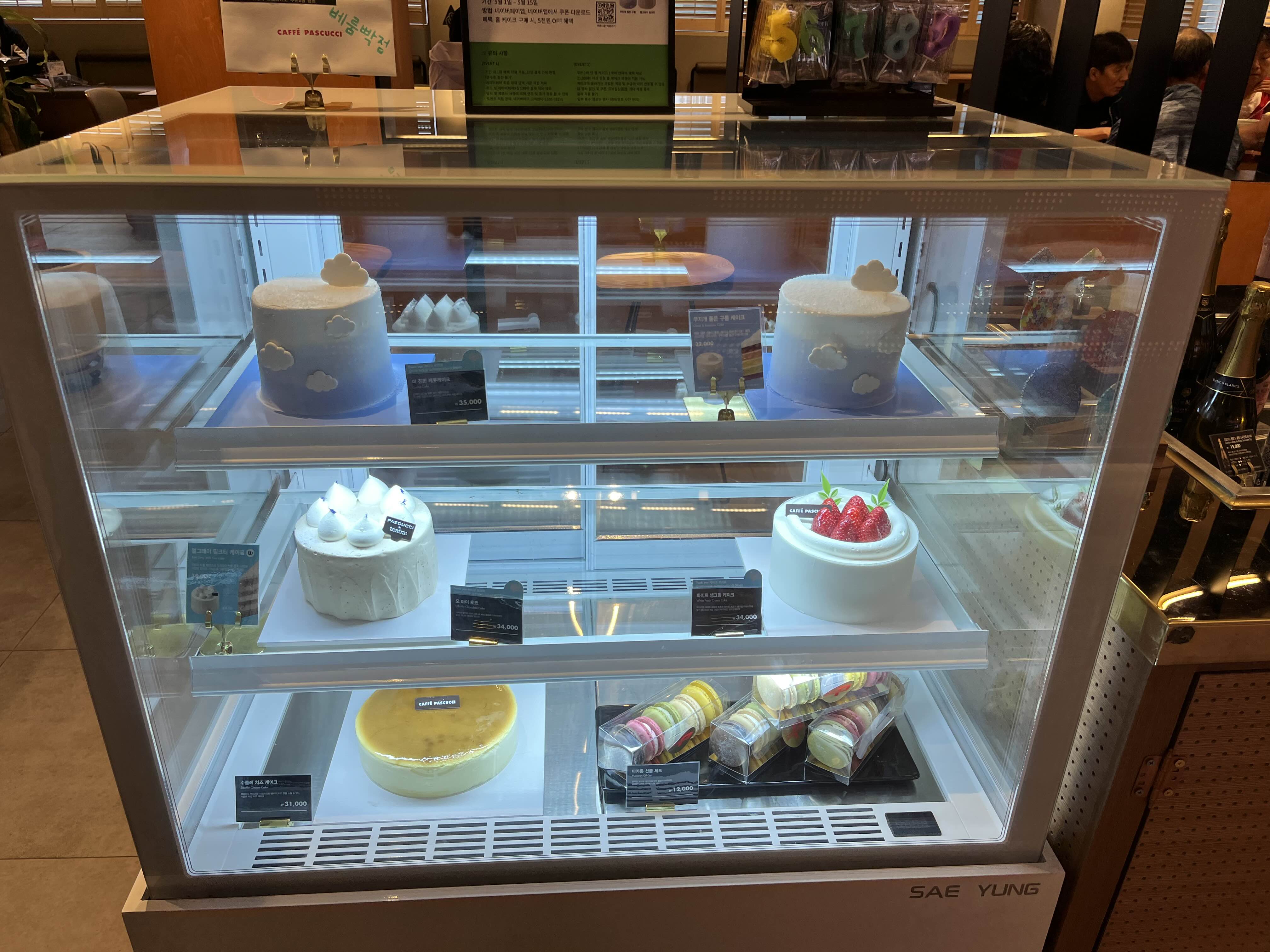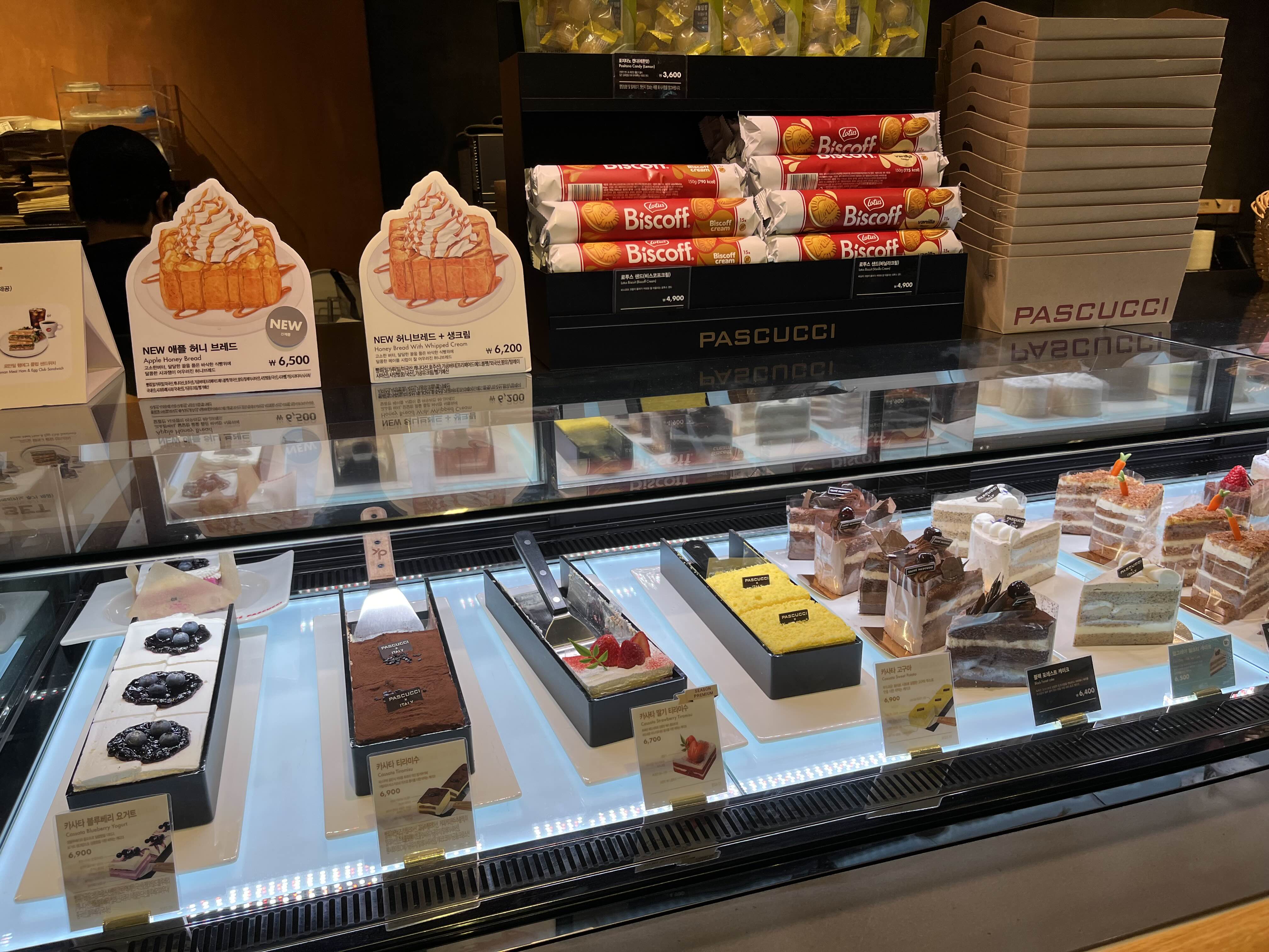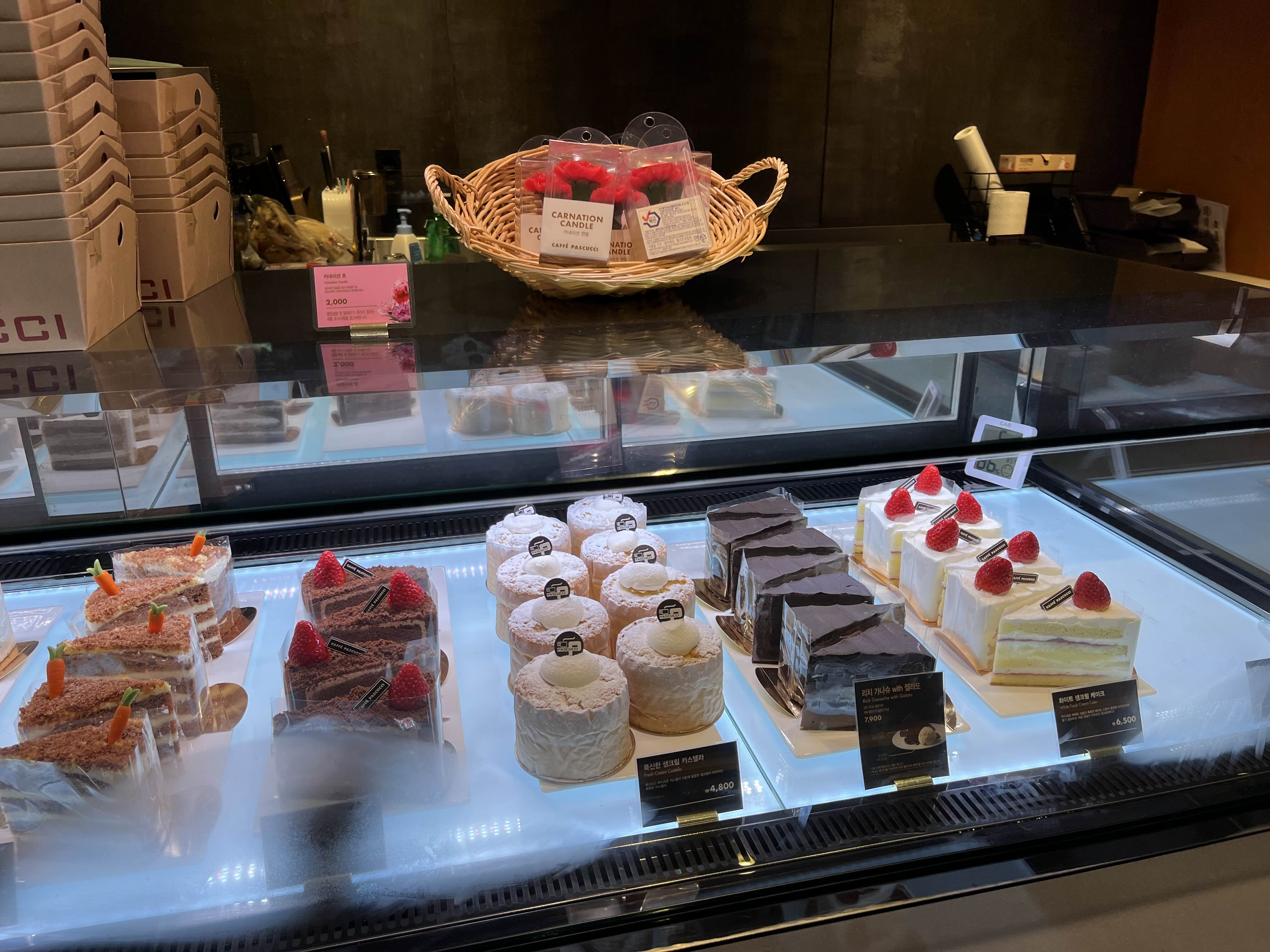 한쪽에는 다양한 홀 케이크와, 샌드위치, 크루와상, 빵, 조각케이크를 판매하고 있습니다.