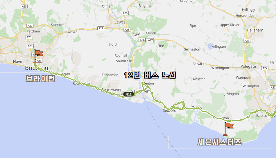 12, 12A, 12X 번 버스를 탑승하면 브라이턴에서 세븐시스터즈까지 이동 가능한데요.