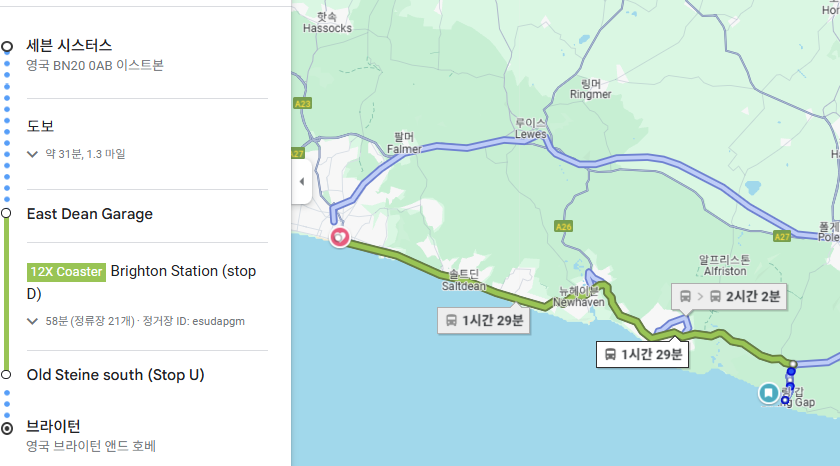 - East Dean Garage 정류장 → 버스 (12X Coaster) → Old Steine South 정류장 : 1시간 소요