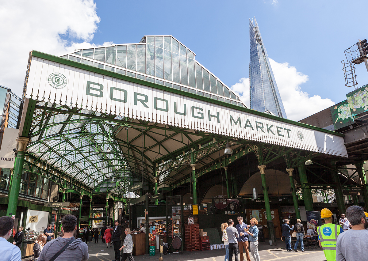 버로우 마켓은 런던의 대표적인 미식 시장으로, 템스 강 남쪽의 런던 브리지 근처에 위치하고 있습니다.