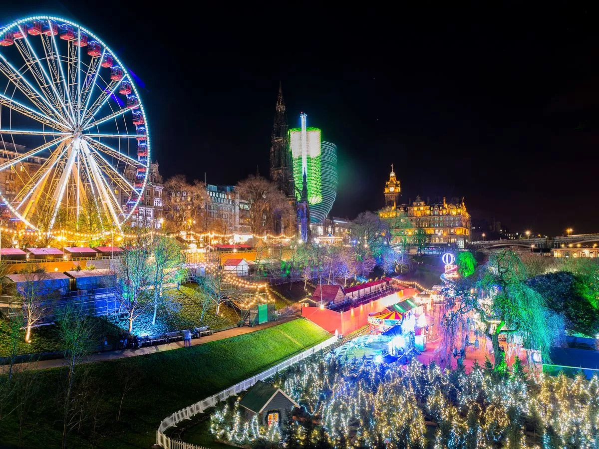 에든버러의 고풍스러운 건축물과 도시의 현대적인 조명이 조화를 이루며 낭만적인 분위기를 자아냅니다.
