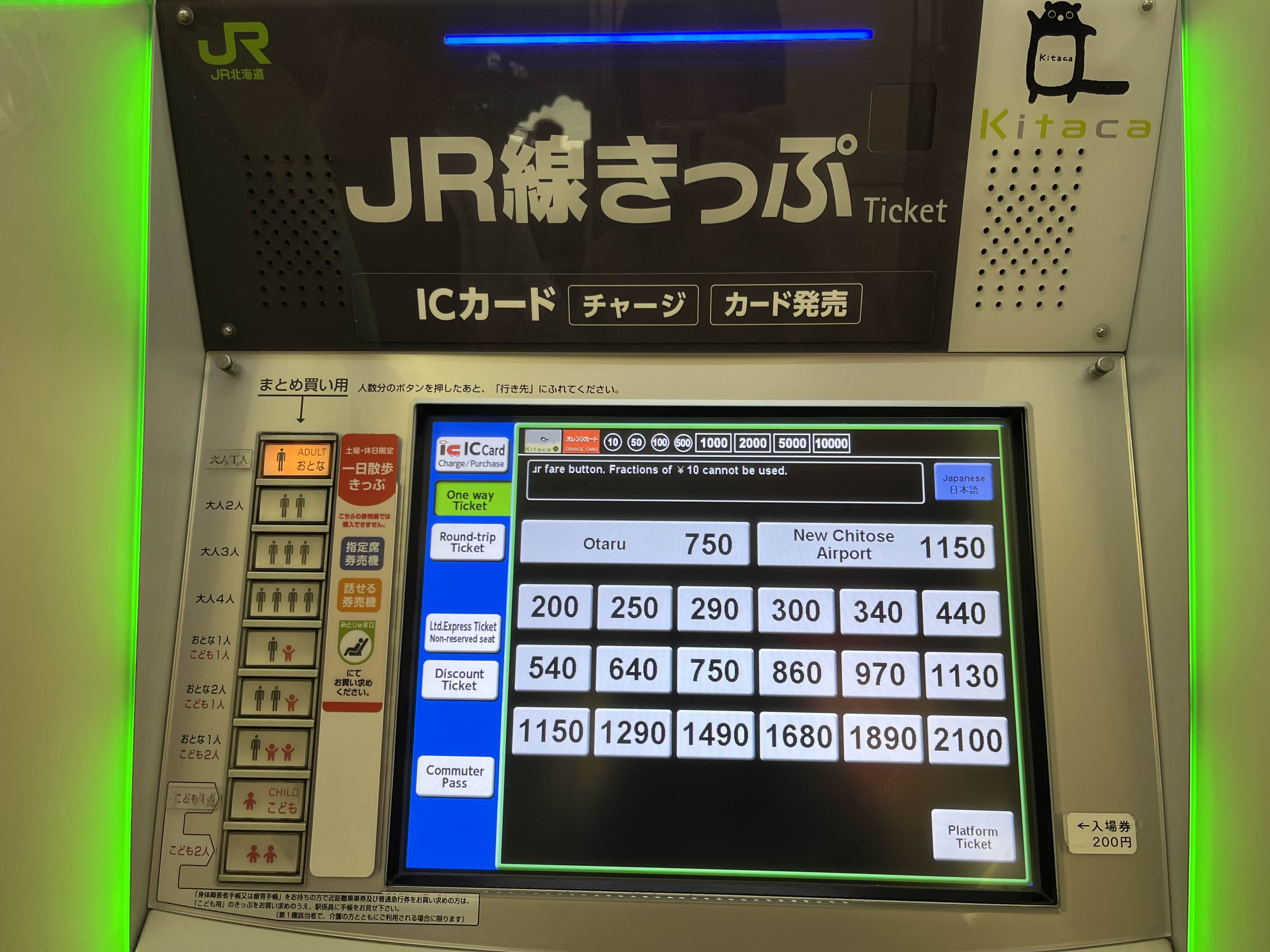 삿포로 역에서 오타루 역까지는 인당 750엔으로, 화면에 보이는 750 을 누르면 되었다!