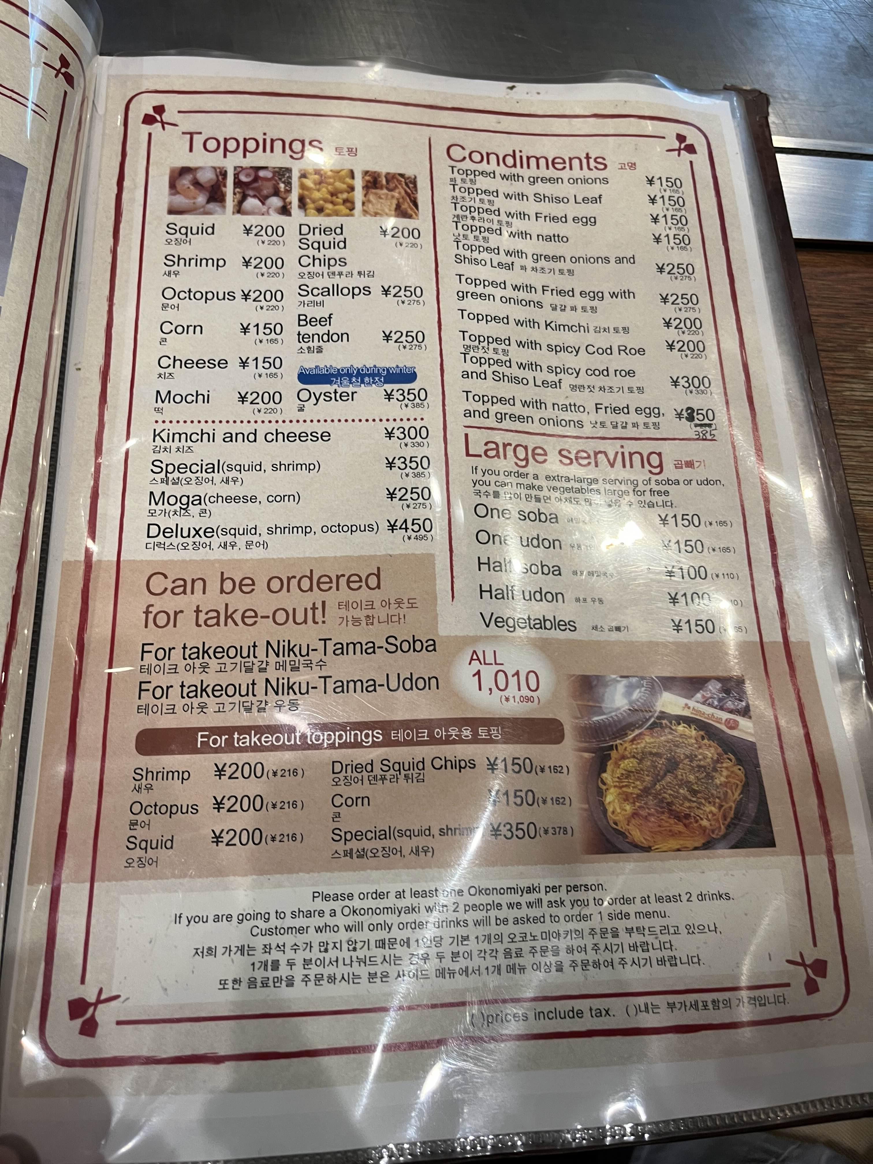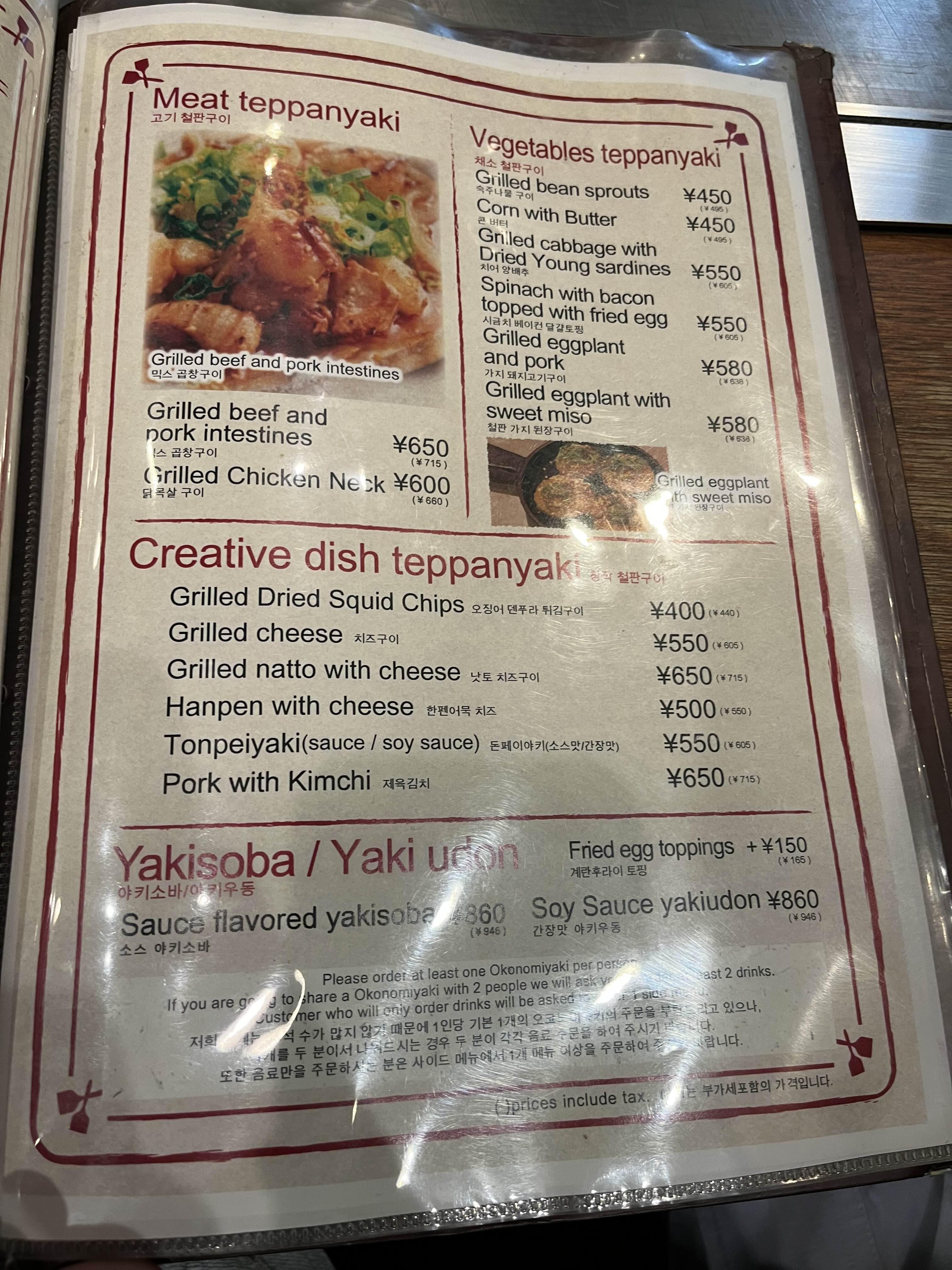 우리는 이곳에 인기메뉴 top1 인 스페셜 고기 달걀 (오징어, 새우 포함) 오코노미야끼와 야끼소바, 숙주나물 철판 구이를 주문했다.