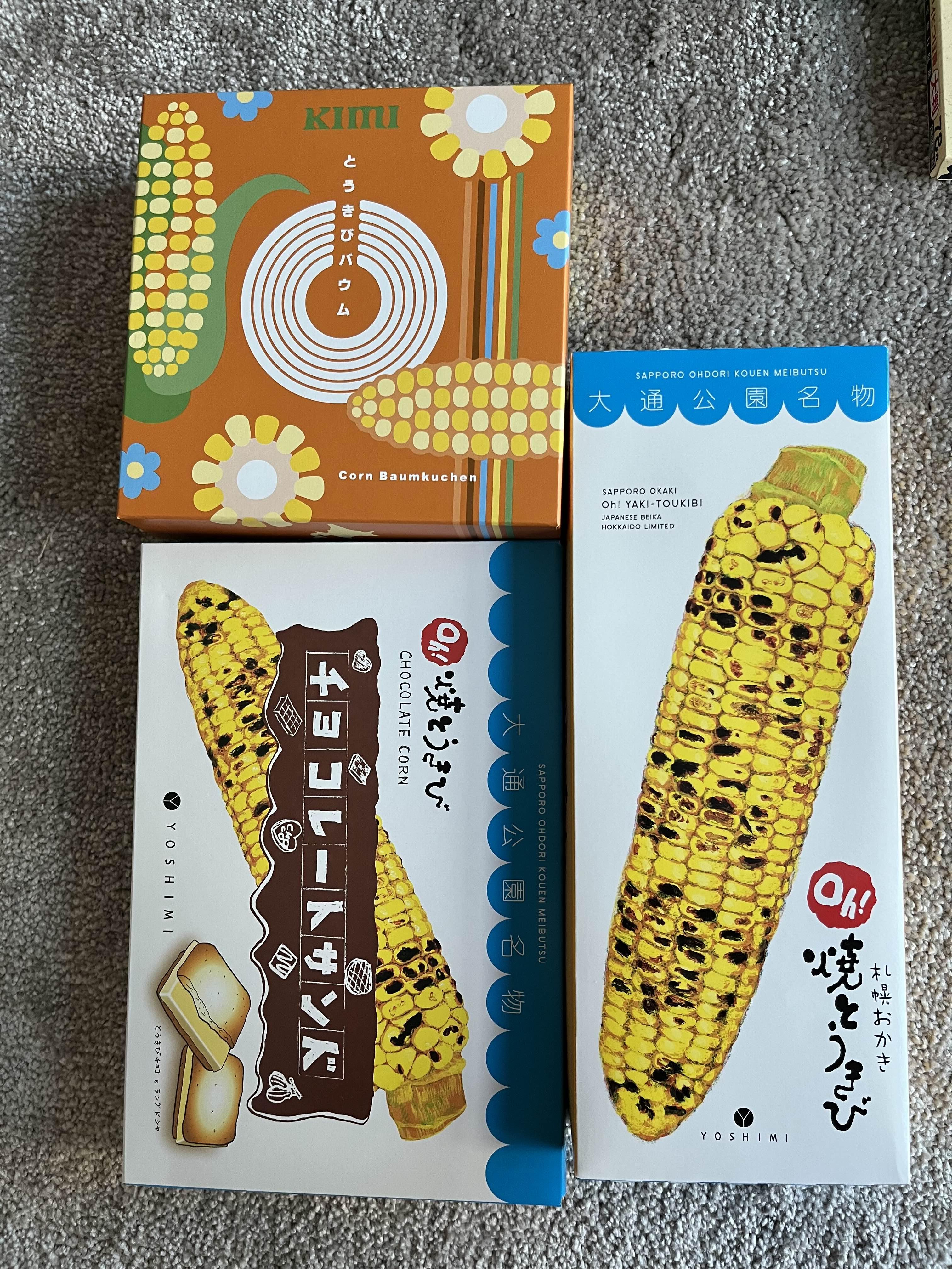 3개는 모두 공항에서 구매했고, 달콤한 옥수수 초콜렛맛이 나는 기념품이다. 아직 옥수수 알갱이 과자는 개봉 전인데, 이것도 삿포로 여행객들이 많이 구매하는 디저트라고 한다.