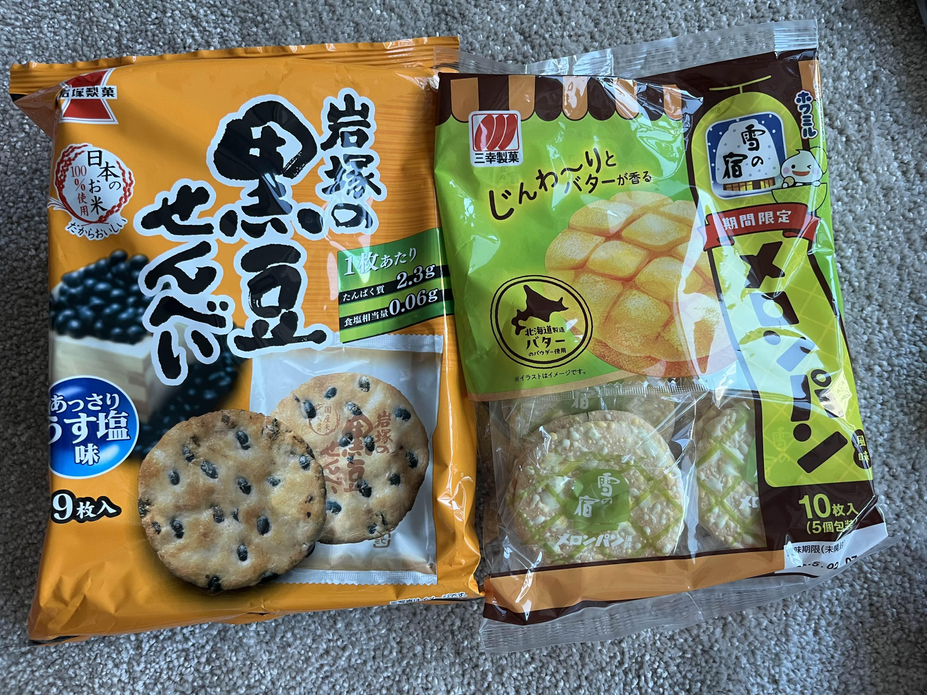 일본은 정말 다양한 종류의 쌀과자를 판매하고 있는데 검은콩이 들어간 짭쪼름한 쌀과자와 메론맛 나는 쌀과자를 사왔다.