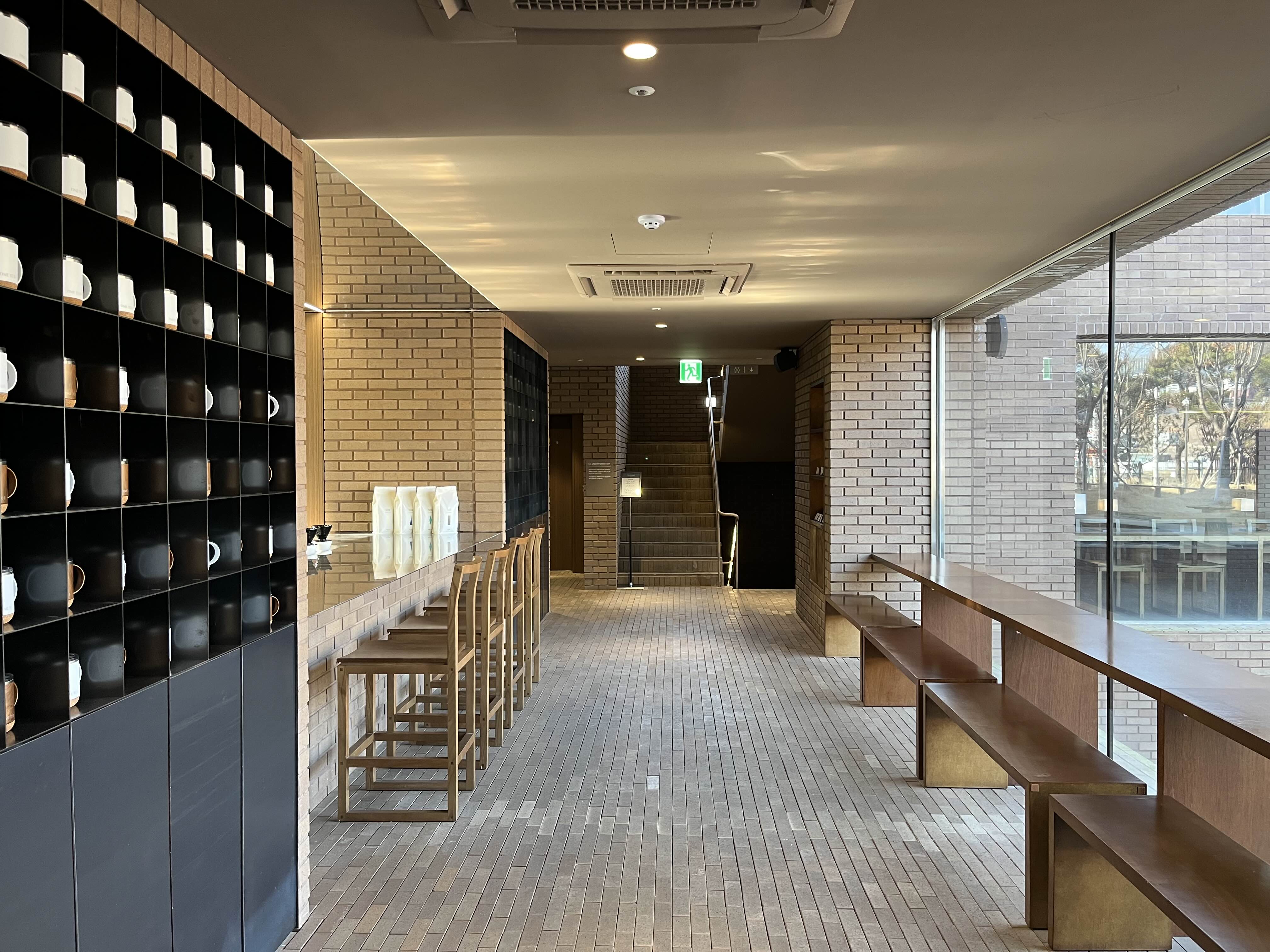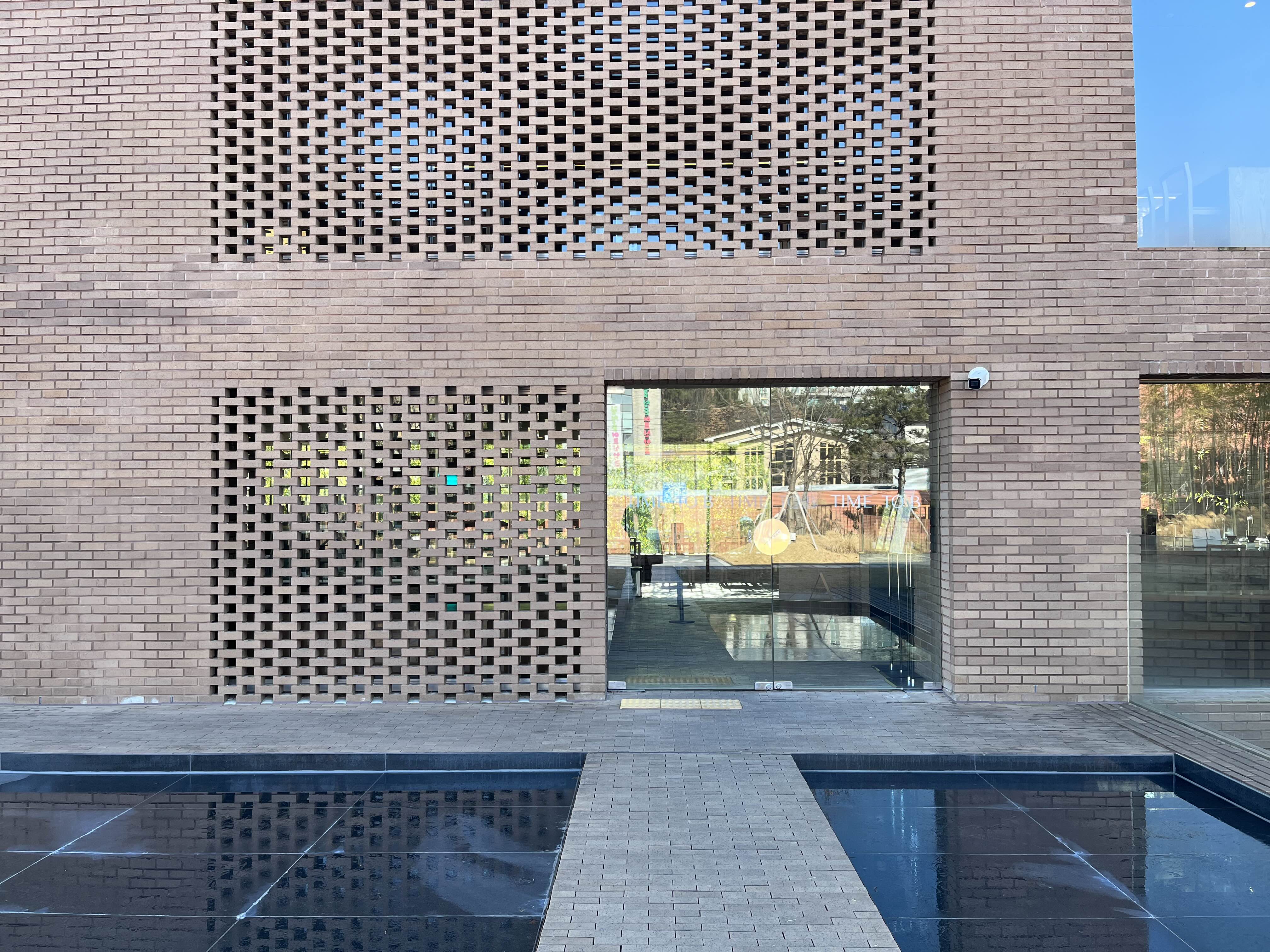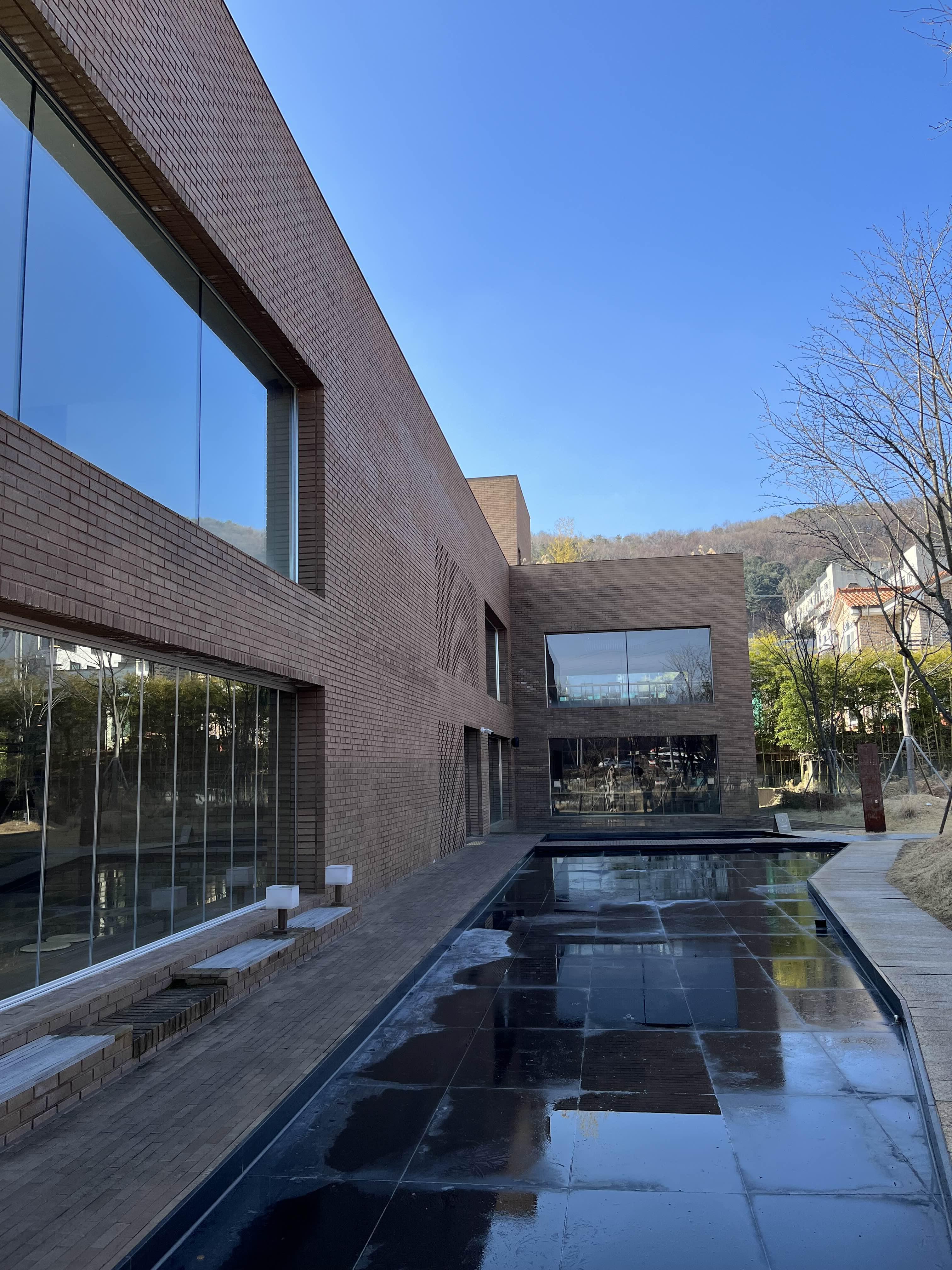 외관은 붉은색 벽돌로 구성되어 있으며, 카페 앞에는 물이 담겨있는 연못과 대나무 등 차분하고 모던한 분위기를 느끼실 수 있습니다.