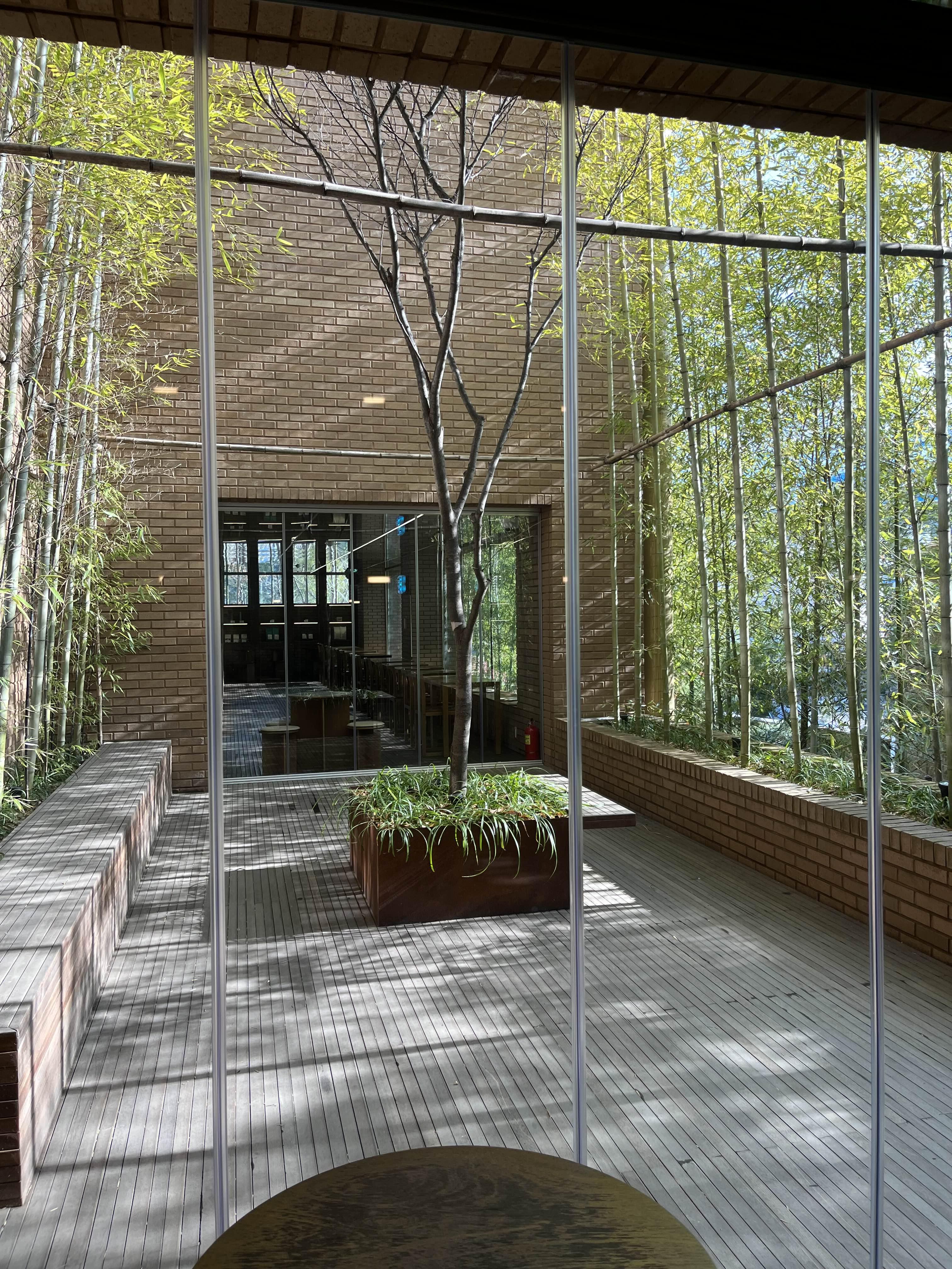 외관은 붉은색 벽돌로 구성되어 있으며, 카페 앞에는 물이 담겨있는 연못과 대나무 등 차분하고 모던한 분위기를 느끼실 수 있습니다.