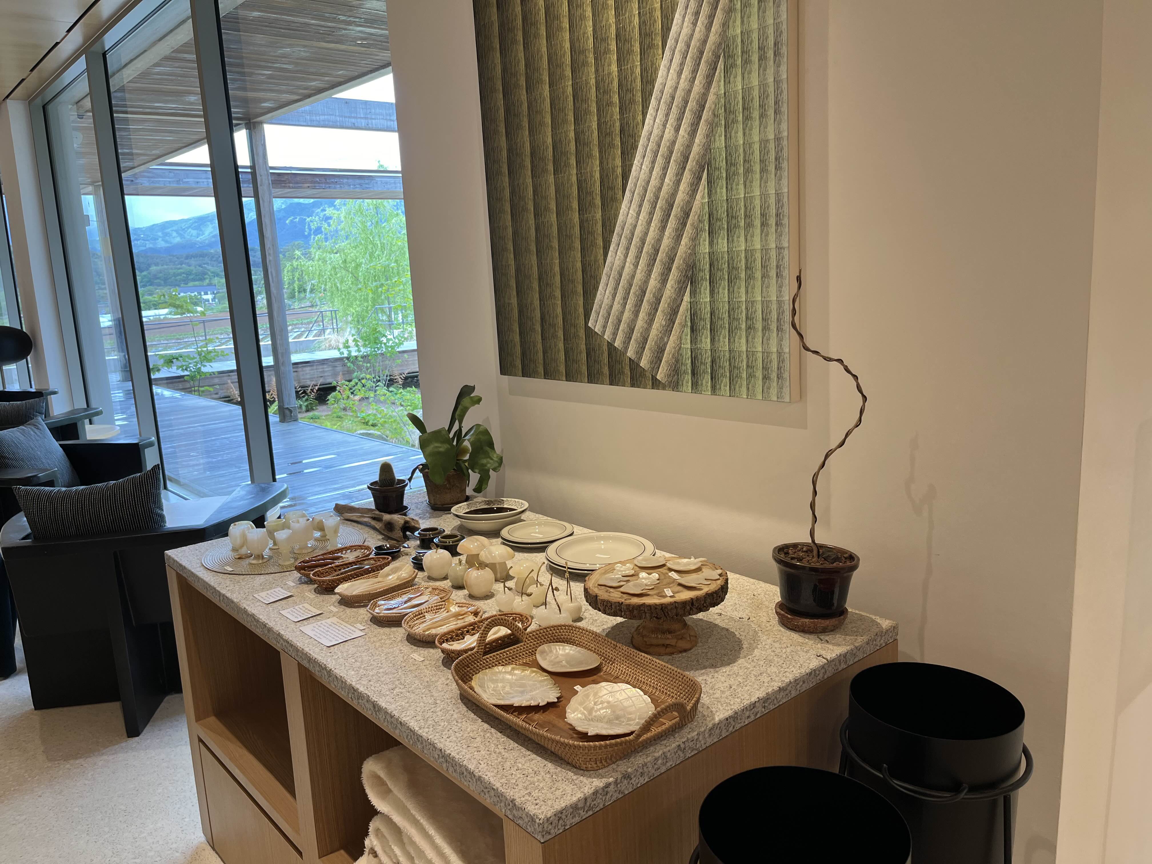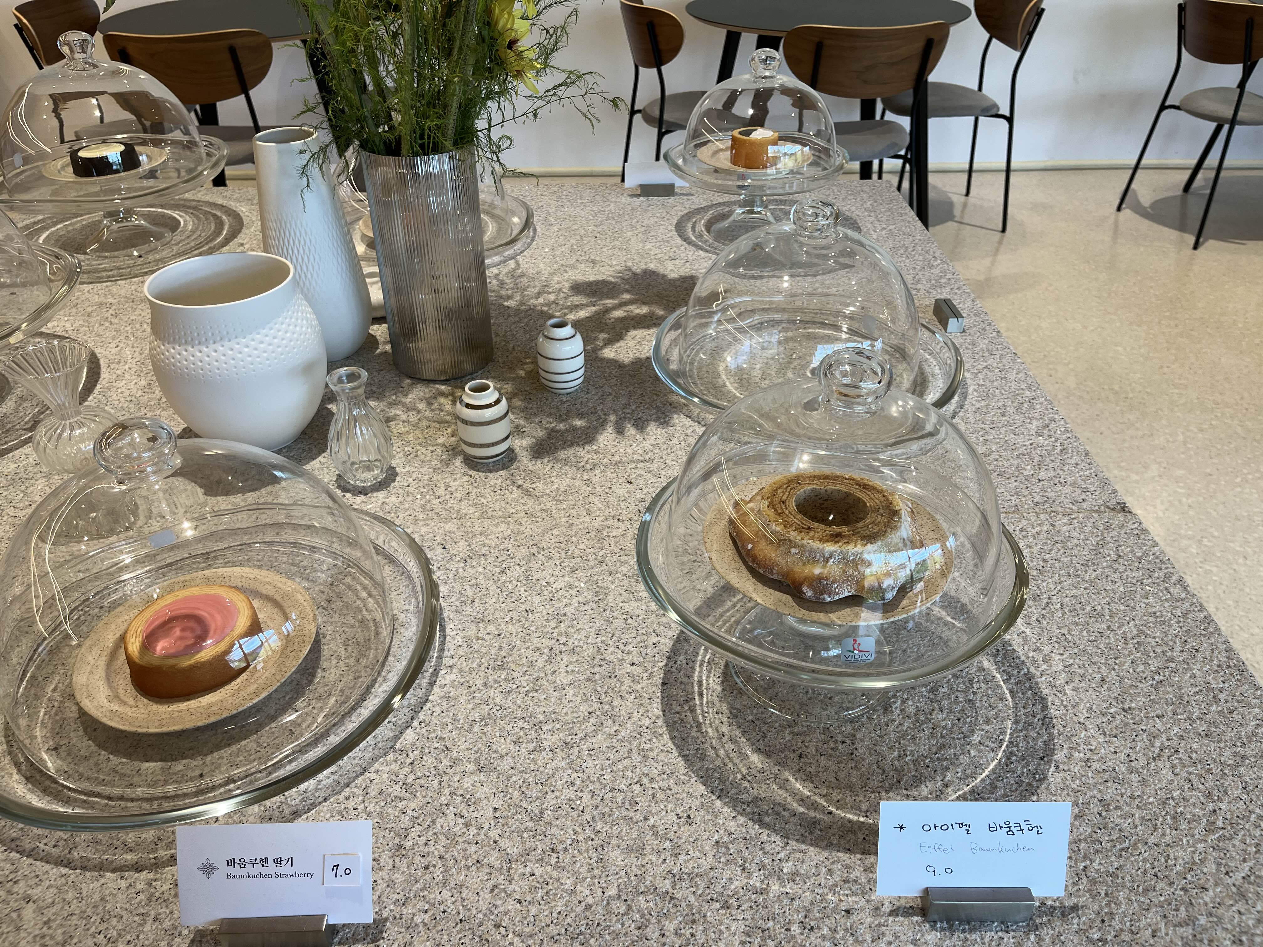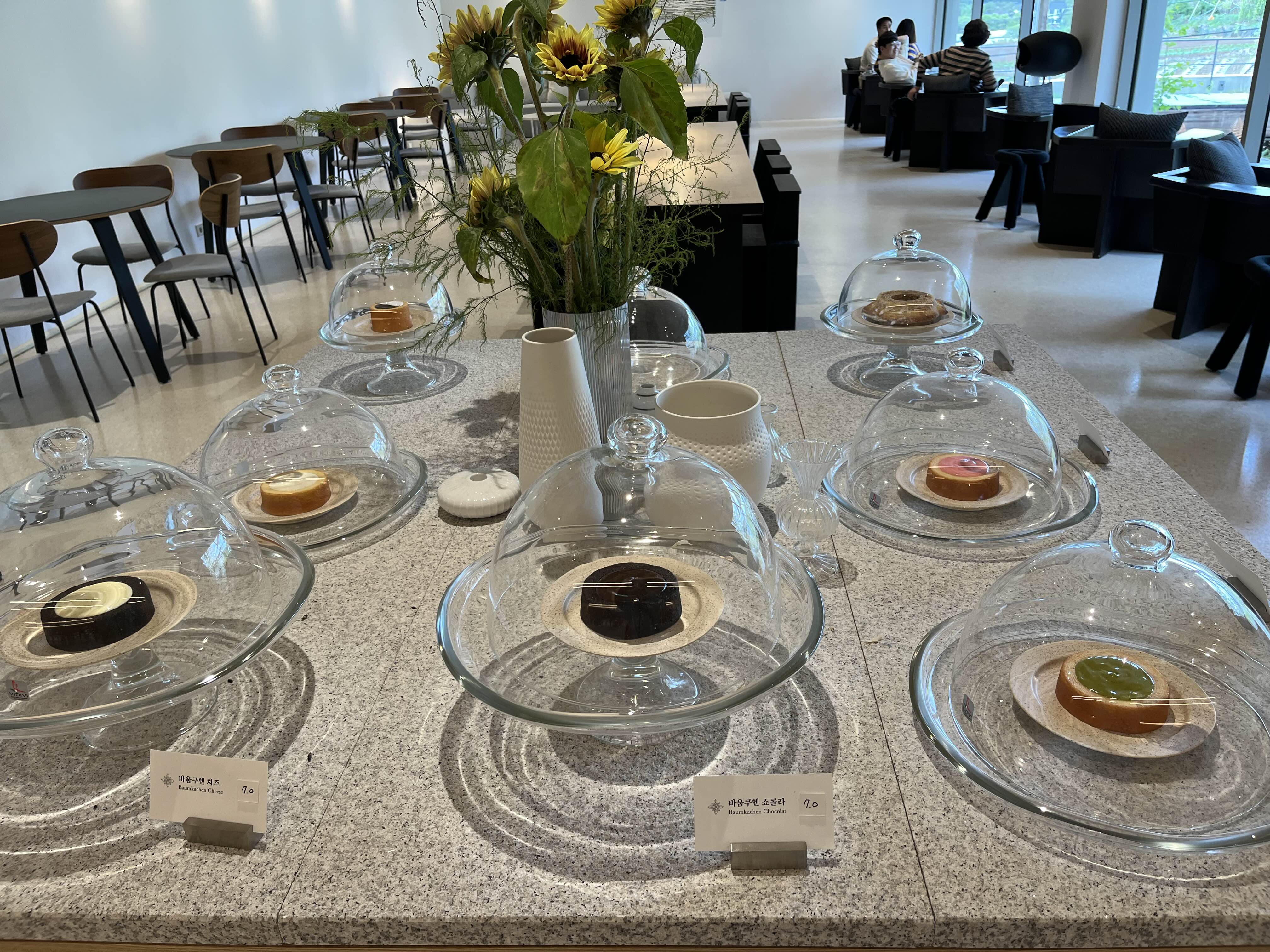 카페 중앙에는 다양한 바움쿠헨 디저트가 놓여있으며, 한쪽 벽면에는 자개로 만든 감각적인 인테리어 소품을 판매하고 있었습니다. : )