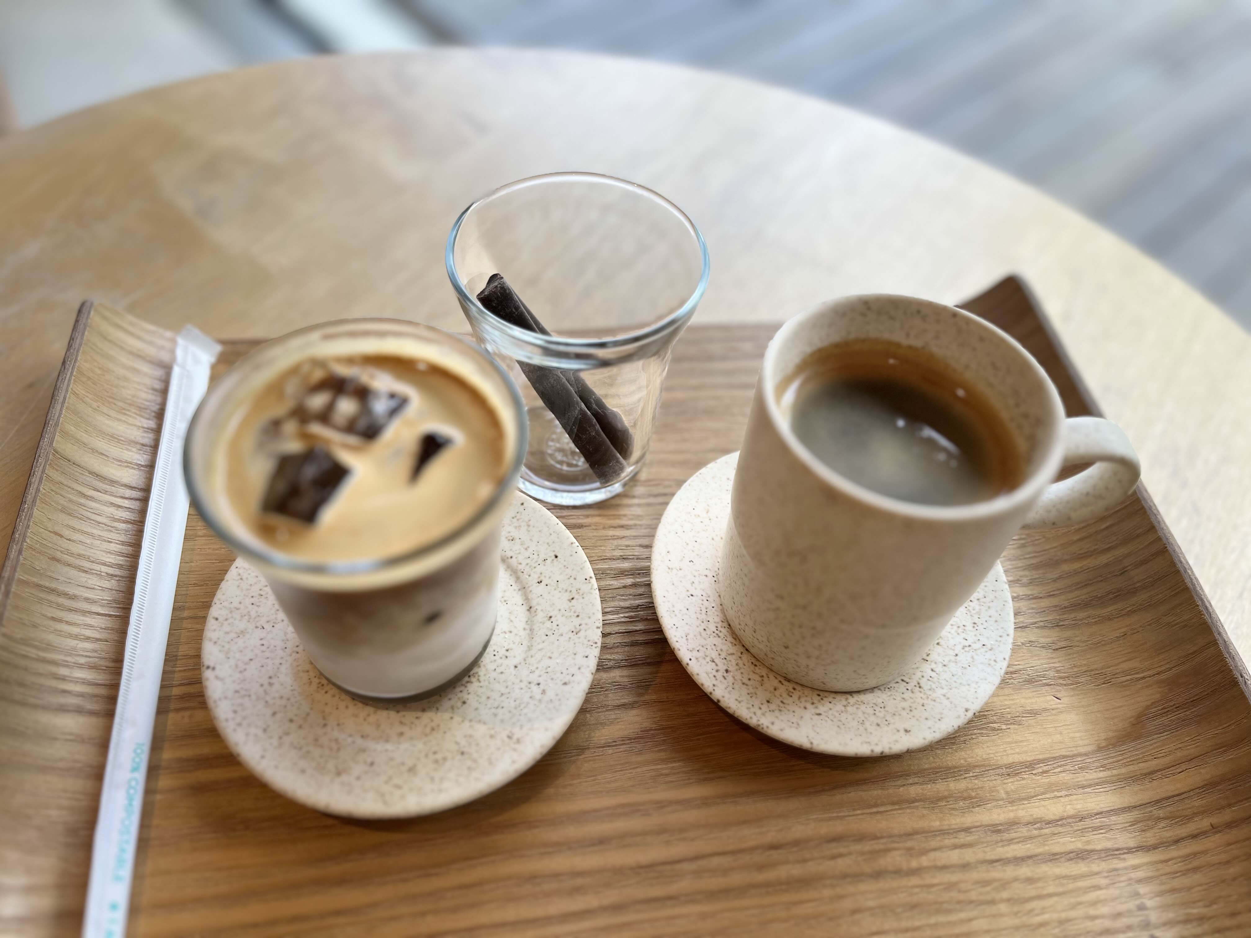 창가에 자리 잡고 따뜻한 아메리카노 (쥬시 롱블랙) 와 플랫 화이트를 주문했습니다.