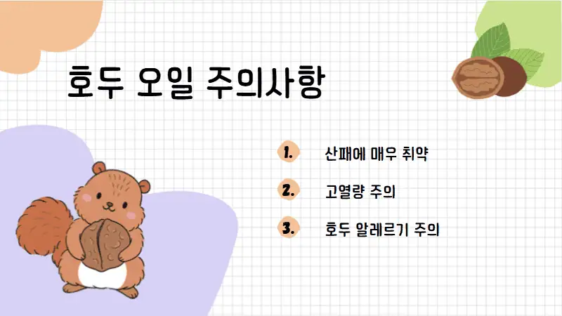 호두 오일은 매우 건강한 오일이지만, 몇 가지 주의할 점이 있습니다.