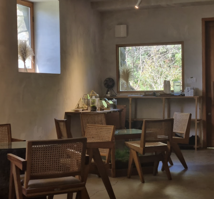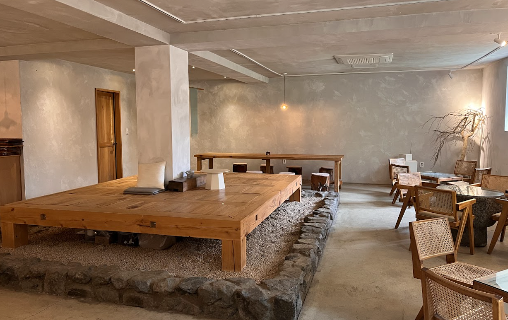 카페에 들어가면 나무와 돌로 정갈하고 따뜻한 분위기의 내부 인테리어를 보실 수 있습니다.