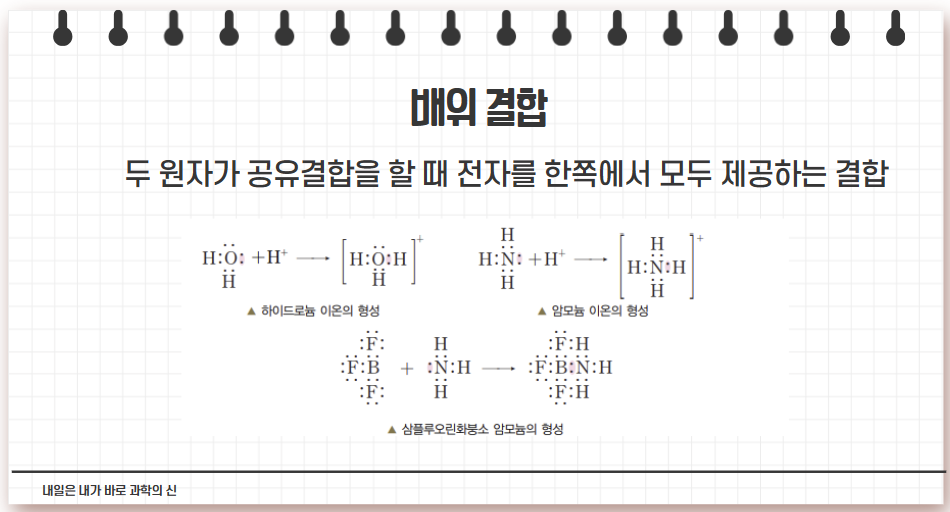 양이온과 비공유 전자쌍을 가진 분자나 원자단 사이의 결합 : 물 분자, 또는 암모니아 분자가 가진 비공유 전자쌍을 수소 이온에게 일방적으로 제공하여 전자를 공유함