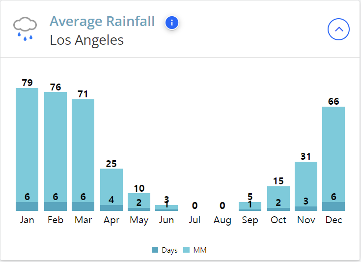 여름에는 거의 비가 오지 않으며 1월 평균 강수량은 79mm 입니다.