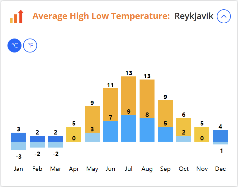 11월~3월 : 날이 춥고 눈이 많이 오지만 오로라 및 빙하 동굴 관찰의 적기입니다.