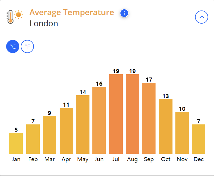 런던의 여름 평균 기온은 19℃로 한국의 여름보다 시원하며 겨울 평균 기온은 5℃입니다.