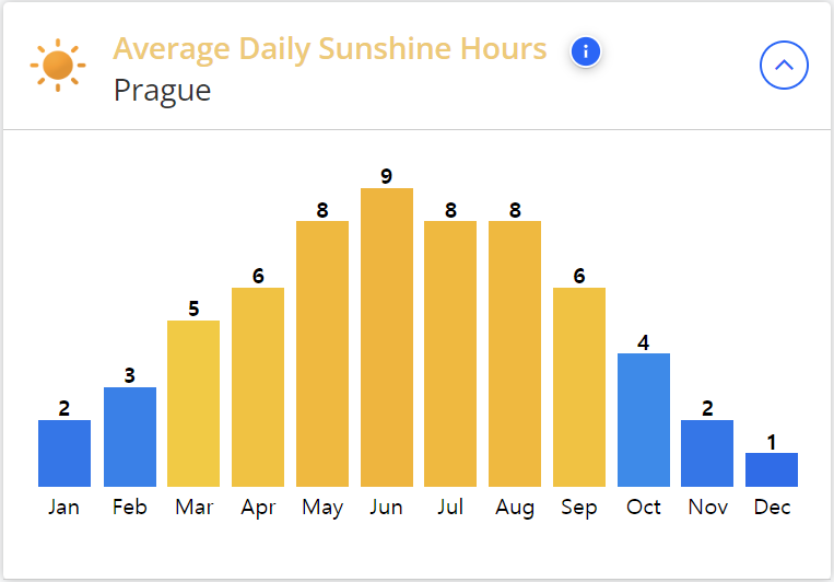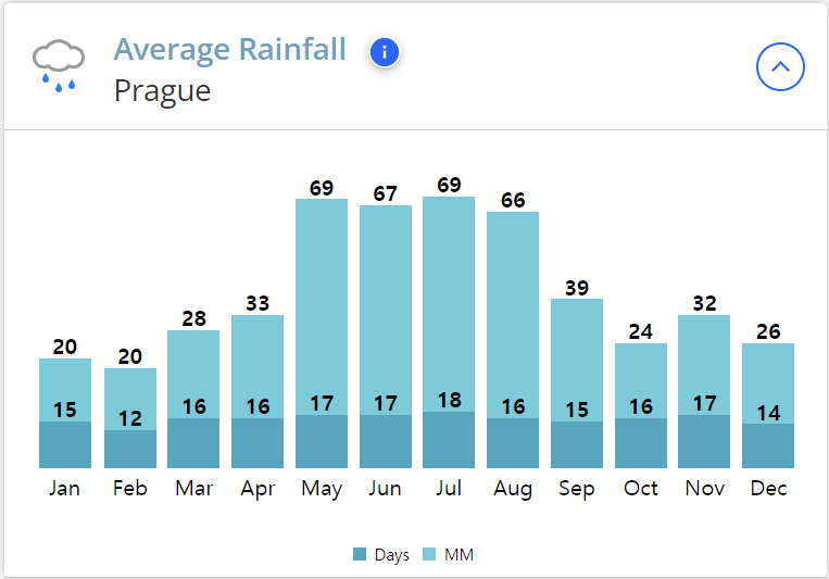 체코 프라하의 여름은 평균 기온 18℃로 한국의 여름보다 서늘하며, 겨울은 평균 기온 -1℃로 한국의 겨울보다 따뜻합니다. 가장 습한 달은 5월로 평균 강수량은 69mm입니다.