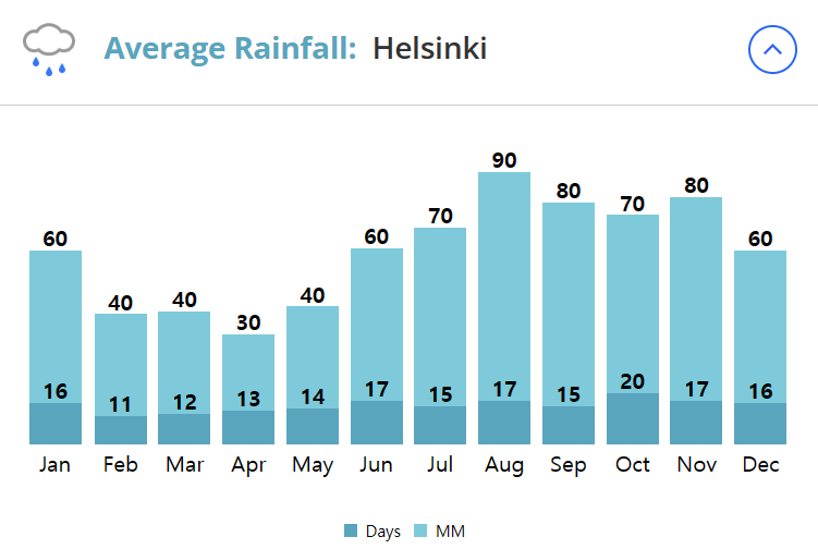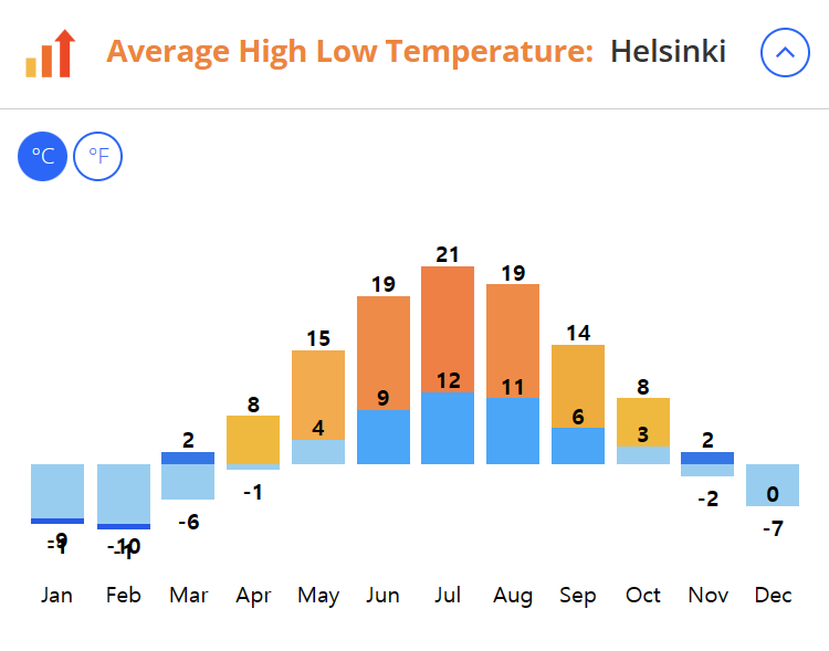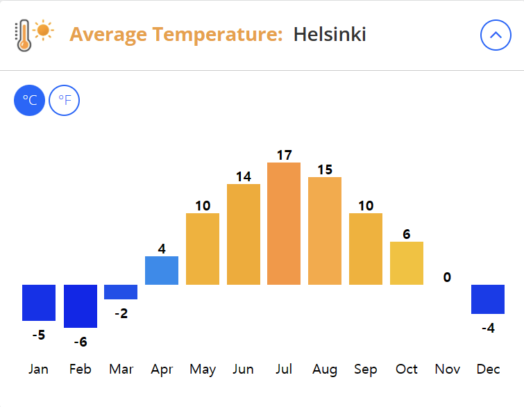 - 헬싱키 기준 겨울 기온은 -5℃ / 여름철 기온은 15℃ 입니다.