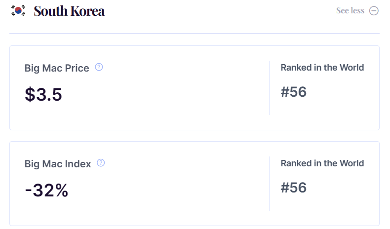 빅맥 지수로 핀란드는 전세계 상위 15위를 차지하며, $4.77 수준이며, 한국의 빅맥 지수는 전세계 56위로 $3.5 입니다.